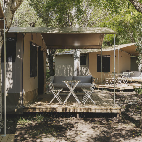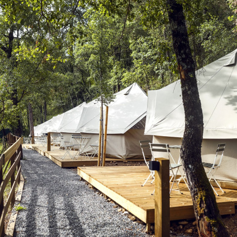 Bell tent y Cottage Family í innovan en la gama de alojamientos ligeros, en un estilo safari. Colocados sobre una plataforma de madera que también sirve como terraza, estos domos de tela acogen de 2 a 5 personas. Especialmente luminosos, en elevación, se integran perfectamente en el entorno. Un entorno sereno, clorofílico, con ligeras fragancias de madera calentada por el sol, y con el sonido del viento entre las hojas, así es el cuadro del camping wecamp Pirineos. Pero sobre todo, encontrarás una verdadera cama, así como las comodidades de electrodomésticos (nevera y microondas) en todos nuestros alojamientos.