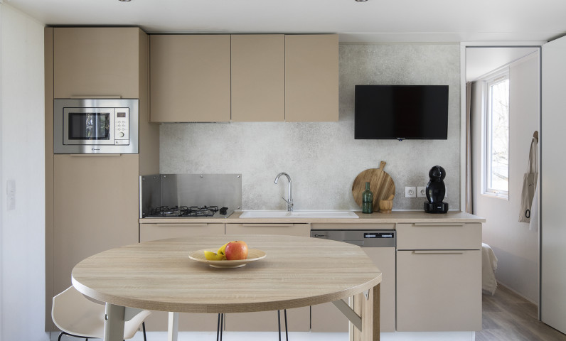 Los Mobil Home Family XL son la elección perfecta para tus vacaciones en familia o con un grupo de amigos, diseñados cuidadosamente por nosotros para alojar hasta 4 personas. Estos modernos mobil homes ofrecen un interior detallado y espacioso para tu comodidad. Cada mobil home cuenta con dos habitaciones bien distribuidas: una con cama de matrimonio y otra con dos camas individuales. Además, disfrutarás de una acogedora terraza con un porche amueblado, ideal para relajarte a la sombra. La cocina está completamente equipada con vitrocerámica, microondas, refrigerador, utensilios de cocina y cubiertos, brindándote la flexibilidad de preparar tus propias comidas. El baño incluye una ducha y WC para tu conveniencia. En esta Mobile home admitimos perros.