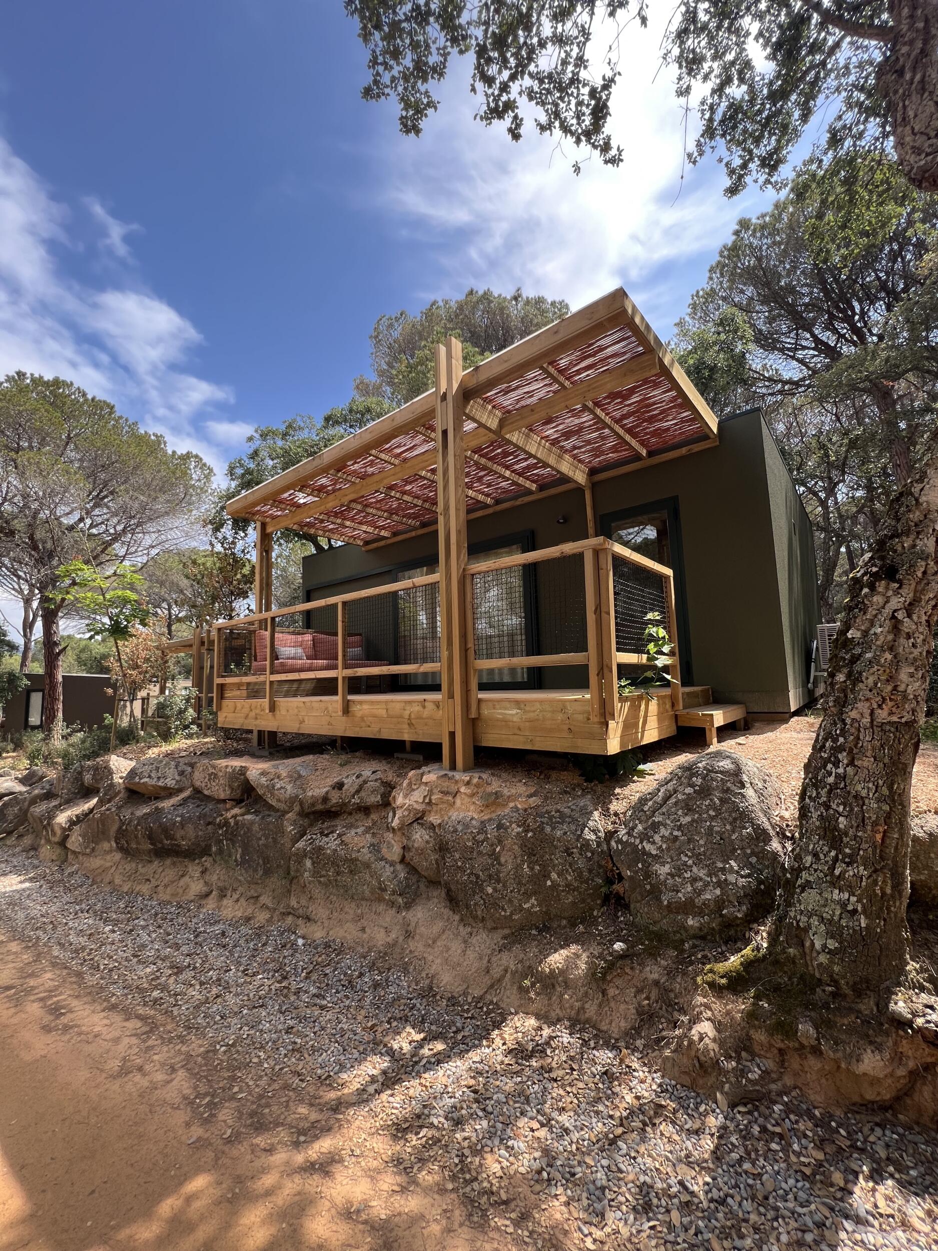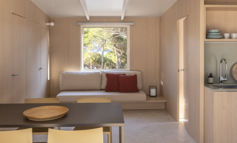 Los Family Mobil Home + son los alojamientos concebidos y diseñados por nosotros para tus vacaciones con tu familia o grupo de amigos hasta 5 personas. Es un nuevo Mobile Home con un interior detallado y espacioso. Es un mobil home de dos habitaciones, una con cama de matrimonio y otra con dos camas individuales. También dispone de una terraza con porche exterior amueblado con sombra. Equipado con cocina con estufa, microondas, refrigerador, utensilios de cocina y cubiertos. Tienen un baño con una pequeña bañera, ducha y WC.