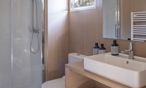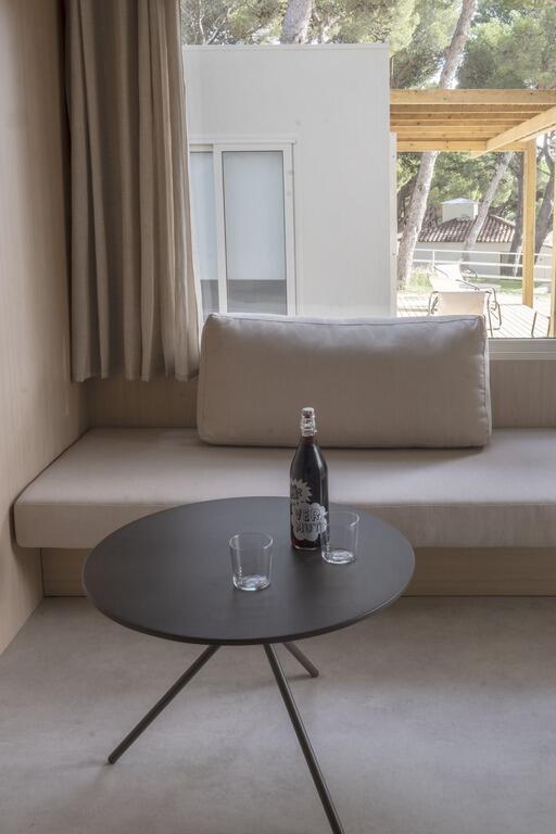 Los Family Mobil Home Compact son los alojamientos concebidos y diseñados por nosotros para tus vacaciones con tu familia o grupo de amigos hasta 4 personas. Es un nuevo Mobile Home con un interior detallado y espacioso. Es un mobil home de dos habitaciones, una con cama de matrimonio y otra con dos camas individuales. También dispone de una terraza con porche exterior amueblado con sombra. Equipado con cocina con estufa, microondas, refrigerador, utensilios de cocina y cubiertos. Tienen un baño con ducha y WC.