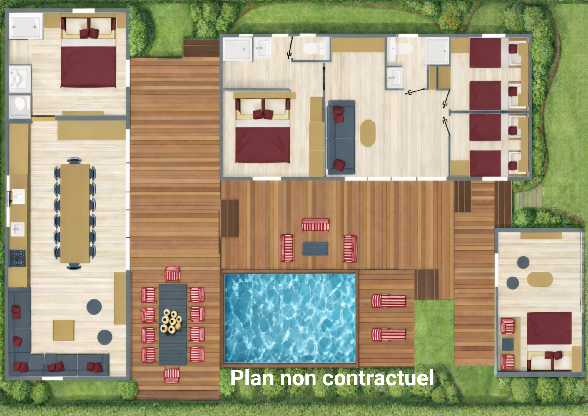 On aime l'espace, la convivialité et le confort que donne ce locatif arrivé au printemps 2026. Services inclus - Lits faits à l'arrivée - Serviettes de toilettes incluses - Ménage de fin de séjour Locatif composé de 3 éléments, avec des espaces cuisine et séjour communs : 5 chambres, 4 salles de douche et 4 WC. Équipements : - 3 terrasses dont 1 couverte, piscine privative, Plancha gaz, Mobilier de terrasse, Étendoir, Bains de soleil, Four, Four micro-ondes, Frigidaire, Congélateur, Lave-vaisselle, Plaque 4 feux gaz, Machine à café Nespresso Original, Cafetière, Bouilloire, Grille-pain, Canapé, TV, Douche, Sèche-serviettes, Sèche-cheveux