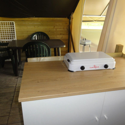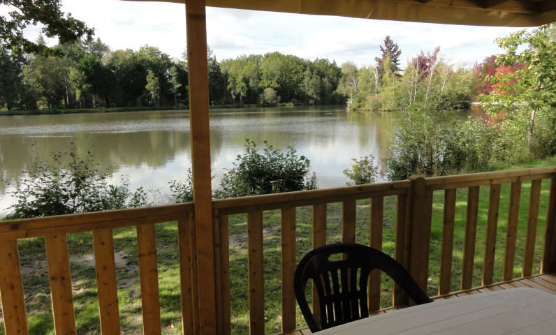 Air conditioning, half covered terrace / Direct view and access to the campsite lake.