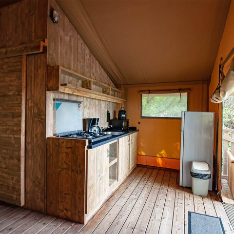 En medio de un entorno virgen, este alojamiento mitad tienda de campaña mitad cabaña de madera te sumerge en plena naturaleza. Arrullado por el canto de los pájaros y el aroma de los pinos, ponte cómodo en nuestras acogedoras habitaciones, el salón principal con cocina americana y la terraza con sombra.