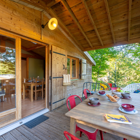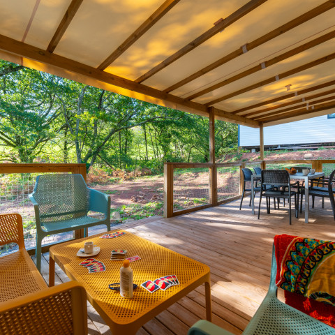 En medio de robles y en un entorno de colinas, su estructura y revestimiento de madera te transportan al corazón de la naturaleza. Relájate completamente en las terrazas de estos espacios de madera, equipadas con tumbonas.