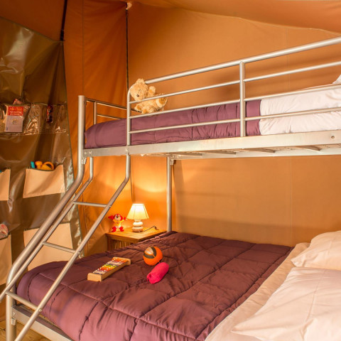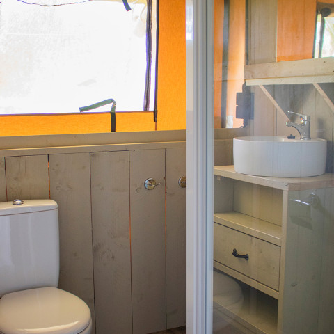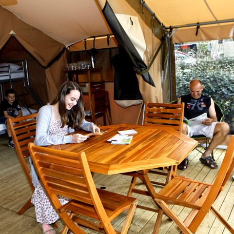 La sala de estar con cocina equipada te permite compartir unos momentos familiares en la terraza contigua amueblada. ¡Al no disponer de sanitarios, este alquiler de lona te permite vivir el camping tradicional al 100 %!