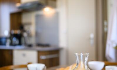 1 cuisine ouverte sur séjour (équipée: vaisselle, caftiere, grille pain ...)