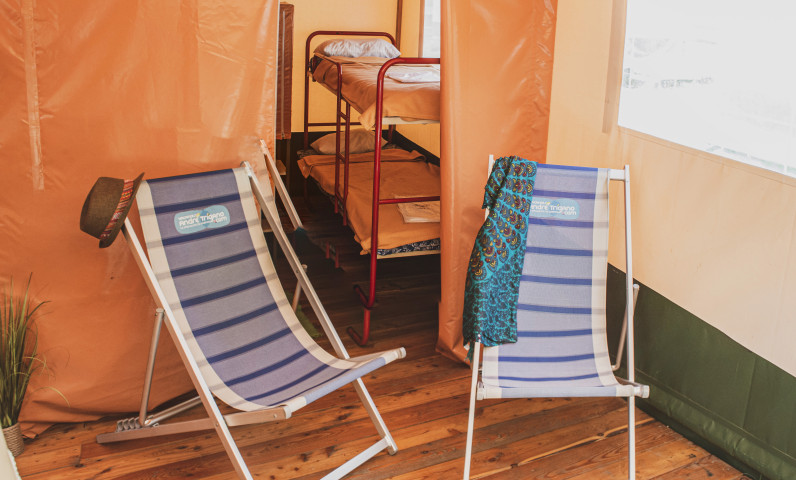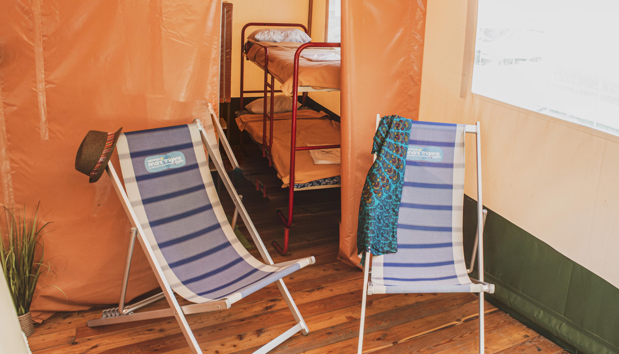 Los BENGALI son bungalows de lona totalmente equipados y sin instalaciones sanitarias. Un interesante compromiso entre acampar y alquilar: acampar sin tener que montar la tienda, llegas y todo está listo. Nuestros BENGALI están situados en un huerto de cerezos.