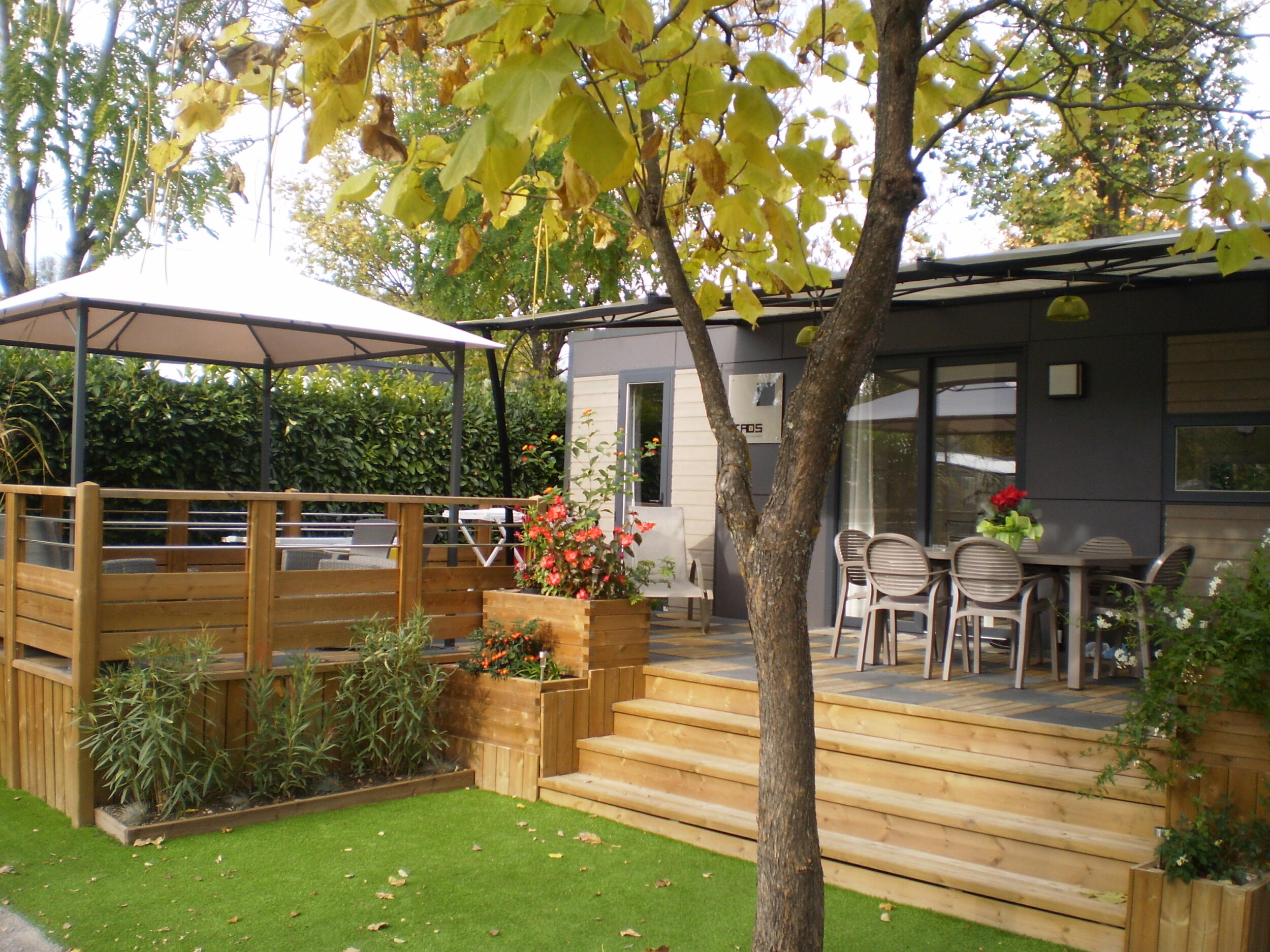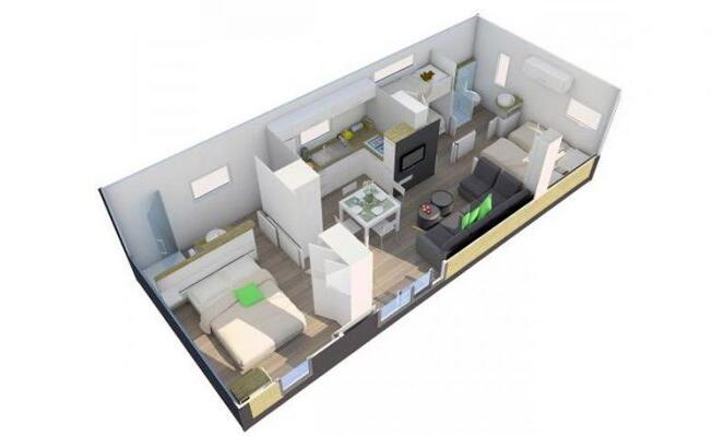 1 dormitorio con 1 cama doble (160 x 200) y TV. 1 dormitorio con 2 camas individuales (80 x 190). 1 dormitorio con 2 literas (80 x 190). Salón con sofá esquinero, TV de pantalla plana y aire acondicionado incluido. Zona de cocina equipada con frigorífico/congelador, lavavajillas, microondas/grill, plancha, secador de pelo, cafetera Senseo, hervidor de agua y tostadora. 2 cuartos de baño (1 con ducha, lavabo y WC separado y 1 con ducha, lavabo y WC) Gran terraza cubierta de madera, muebles de jardín y 4 tumbonas.
