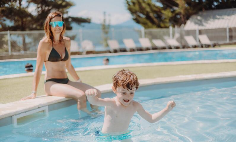 Desde la apertura del camping puedes sumergirte en la zona acuática de 300 m², con una playa de 3 000 m². Relájate bajo el sol de los Alpes en la piscina exterior, mientras tus pequeños se divierten en la piscina infantil.