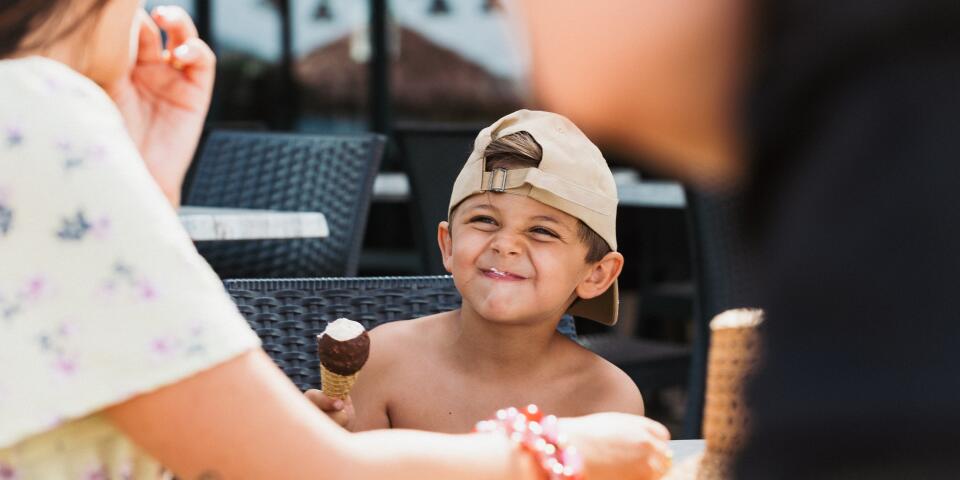 Grandes y pequeños disfrutan de las vacaciones tomando una copa de helado o un delicioso zumo de frutas en el bar.
