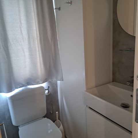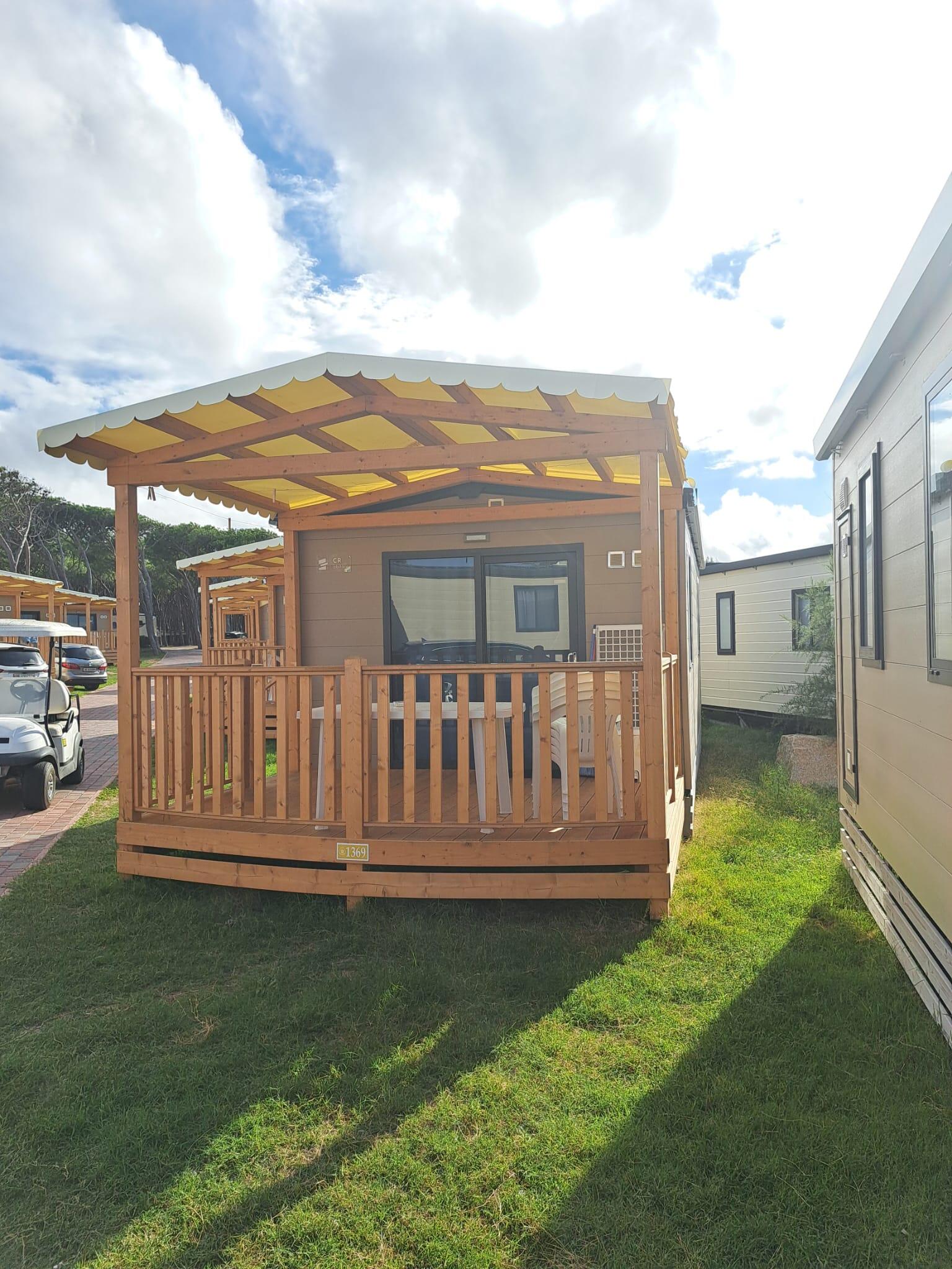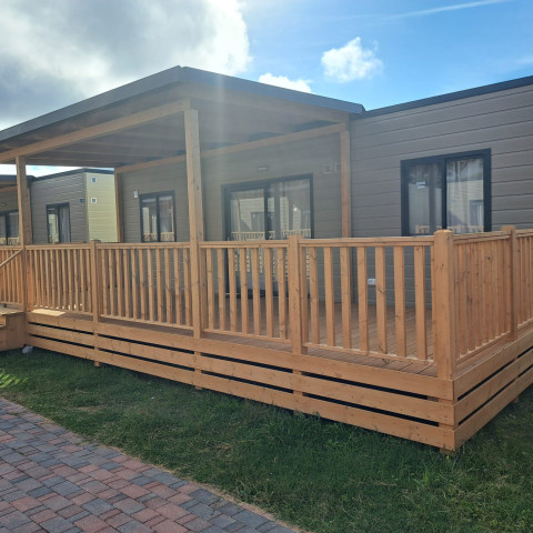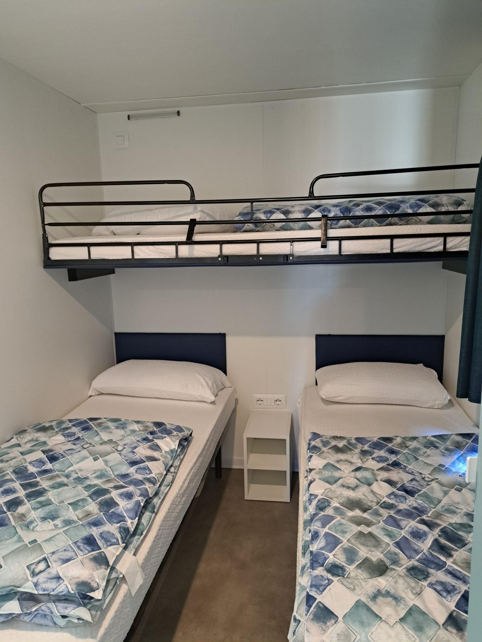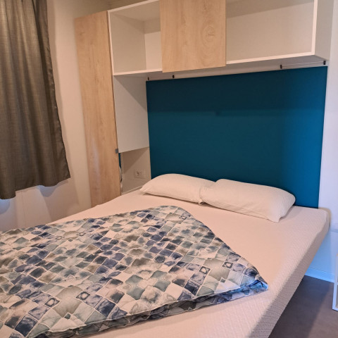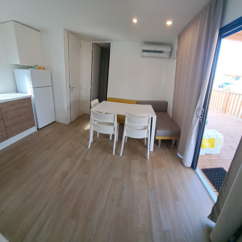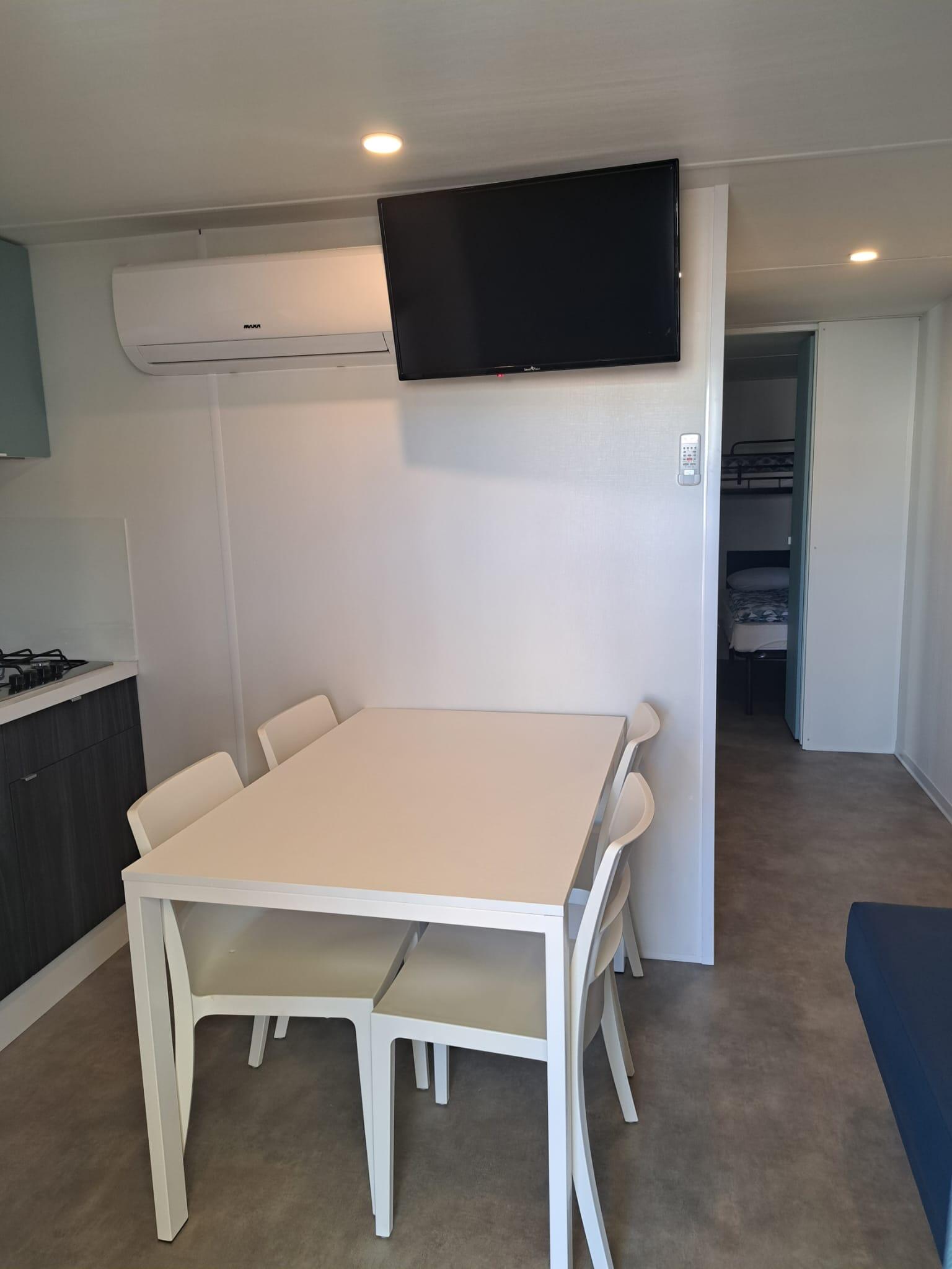 It has an area of 25mq and can hold up to 4 adults and one child. It is composed of a living room with table and chairs, a kitchenette equipped with a column fridge with a freezer, a 4-burner gas cooker, a sink, pots and pans and dishes. The sleeping area consists of 2 bedrooms, one with a double bed and one with 2 single beds. The accommodation has 1 complete bathroom with toilet, shower and sink .A covered wooden veranda equipped with table and chairs allows you to enjoy the outdoor spaces, typical of a holiday in nature.
