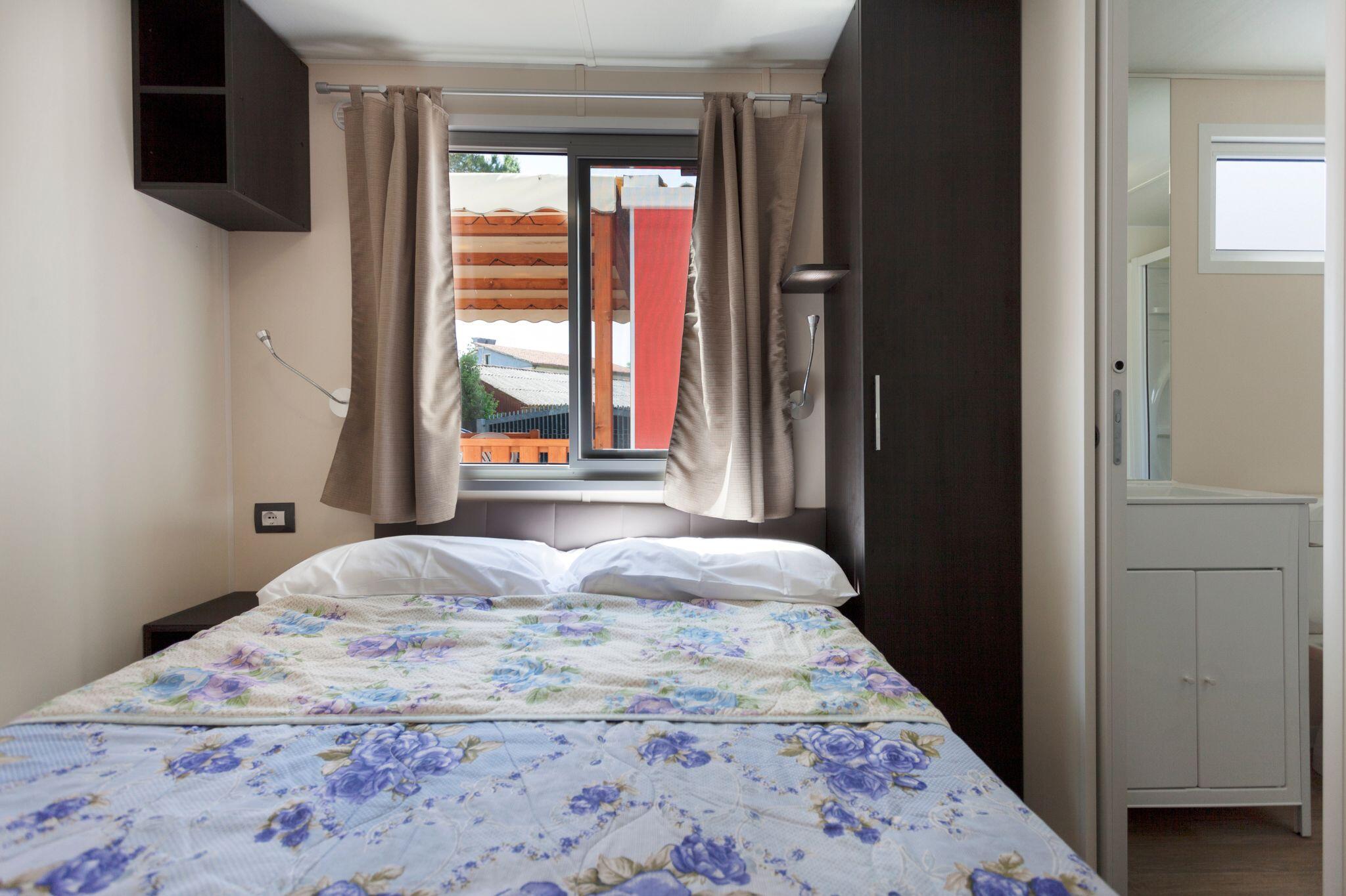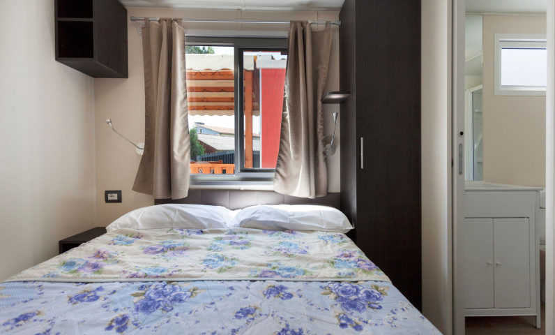 It has an area of 25 sq.m. and can hold up to 4 persons. It is composed of a living room with table and chairs, a kitchenette equipped with a column fridge with a freezer, a 4-burner gas cooker, a sink, pots and pans and dishes. The sleeping area consists of 2 bedrooms, one with a double bed and one with 2 single beds. The accommodation has 1 complete bathroom with toilet, shower and sink and 1 bathroom with WC and washbasin. A covered wooden veranda equipped with table and chairs.
