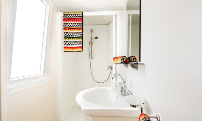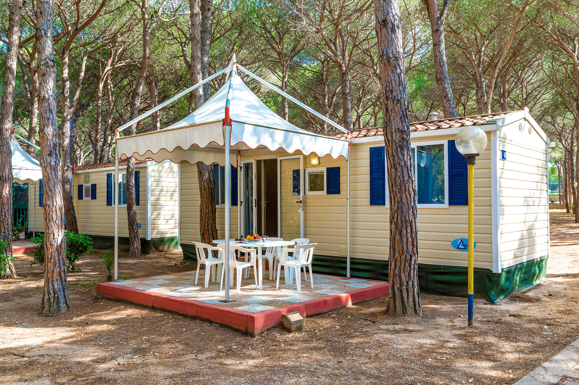 Blu Romantic It has an area of approximately 24 square meters and can sleep up to a maximum of 4 adults and 2 children. The price includes 4 adults. The cost for the additional child is €2.80 per day. Communicate the exact number of guests at the campsite. It is composed of a bedroom with double bed, a bedroom with 2 single beds (may be joined) and a third raised bed, living room with table, chairs and sofa bed, a bathroom with shower and basin, a bathroom with toilet and sink, kitchenette with sink and refrigerator. The mobile home includes satellite TV, cutlery, crockery, blankets and pillows. Air conditioning has to be paid extra (please check price list)