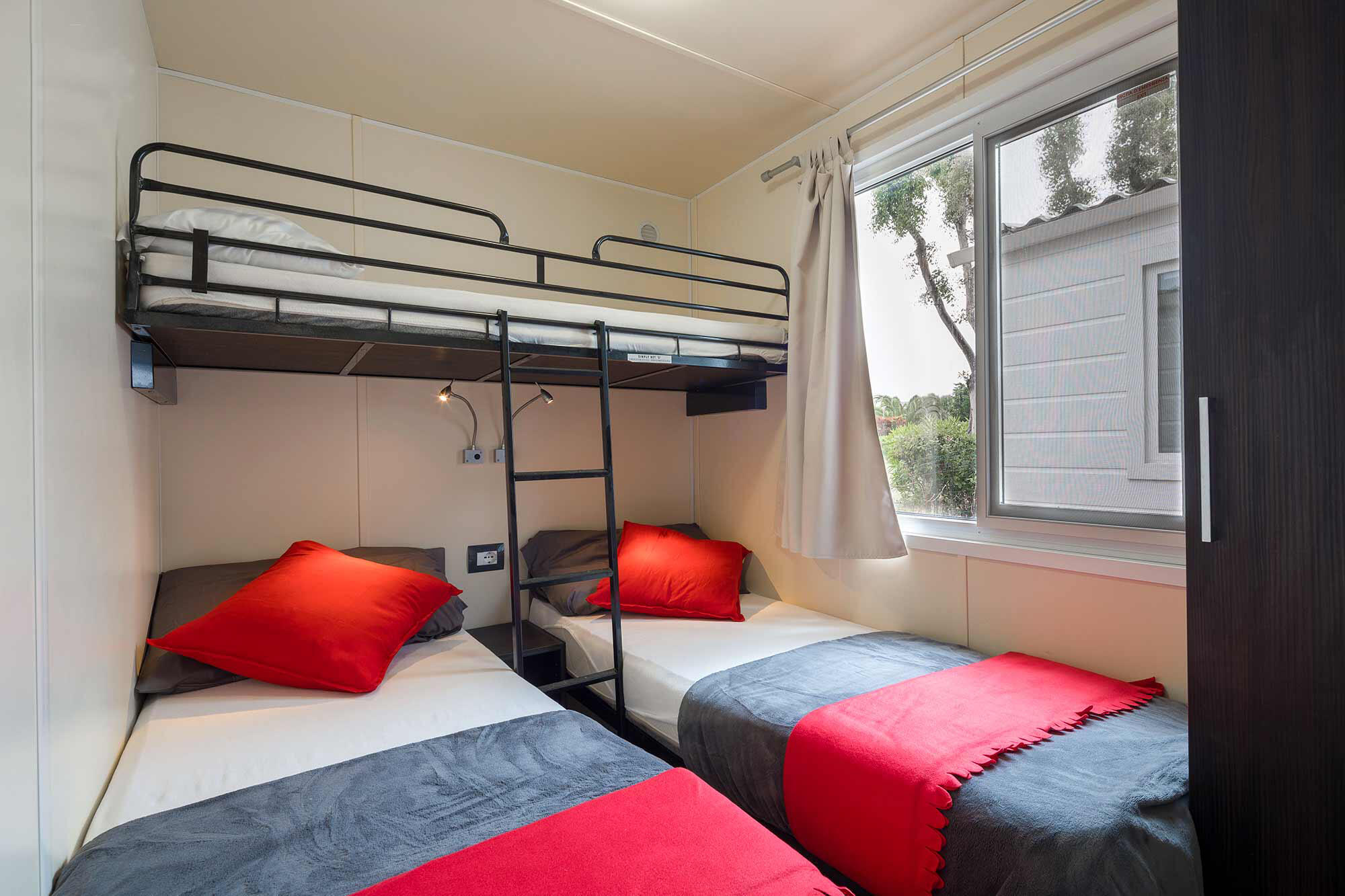The sleeping area consists of 2 bedrooms, one with a double bed and one with 3 single beds with bankbed.