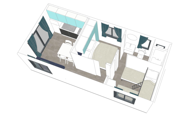 It has an area of 25,5 mq and can hold up to 5 persons. It is composed of a living room with table and chairs, a kitchenette equipped with a column fridge with a freezer, a 4-burner gas cooker, a sink, pots and pans and dishes.
