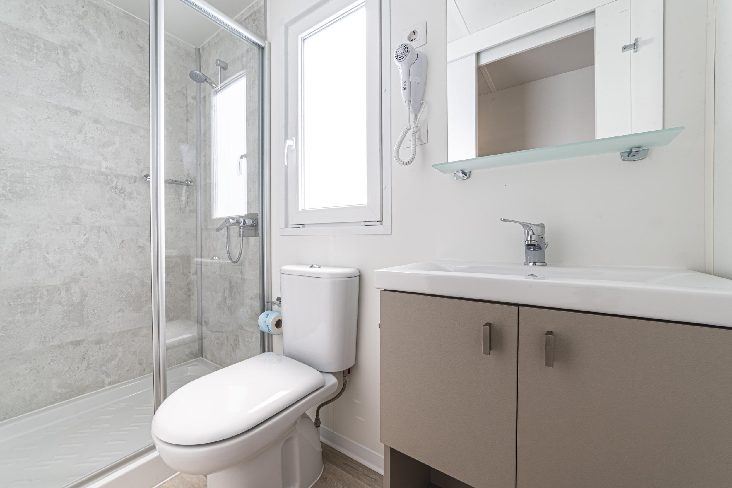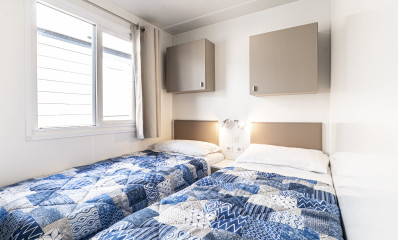 The new Baia Revolution with its 34 sq.m. is the ideal solution in order to host large families, up to 6 persons. It has modern and comfortable interiors: the living room is furnished with table and chairs, a comfortable sofa, a kitchenette equipped with a column fridge with freezer, a 4-burner gas cooker, sink, pots and pans. The sleeping area consists of 3 bedrooms, one with a double bed, one with 2 single beds and a bedroom with a bunk bed. The accommodation has 2 bathrooms complete with shower, sink, and toilet. A covered wooden veranda equipped with table and chairs allows you to enjoy the outdoor spaces, typical of a holiday in nature. Bring your four-legged friend with you: some units of this type are pet-friendly.