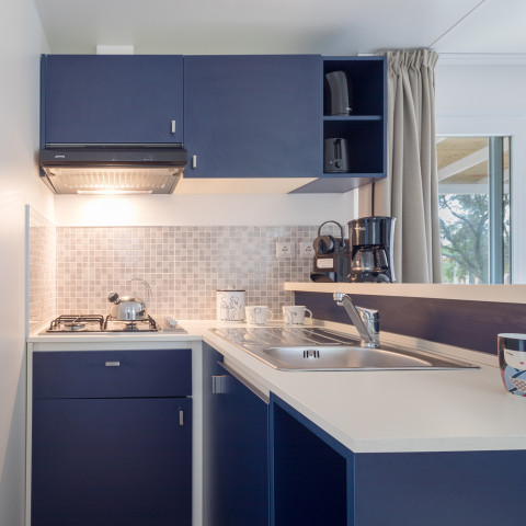 It has an area of about 32 sq.m. and can hold up to 6 persons. It is composed of a living room with a table and chairs, a kitchenette equipped with a column fridge with a freezer, a 4-burner hob, a sink, pots and pans and dishes. The sleeping area consists of 3 bedrooms, one with a double bed and 2 with 2 single beds. The accommodation has 1 bathroom with WC , shower and sink. There is a TV. A spacious covered wooden veranda equipped with table and chairs allows you to enjoy the outdoor spaces, typical of a holiday in nature.