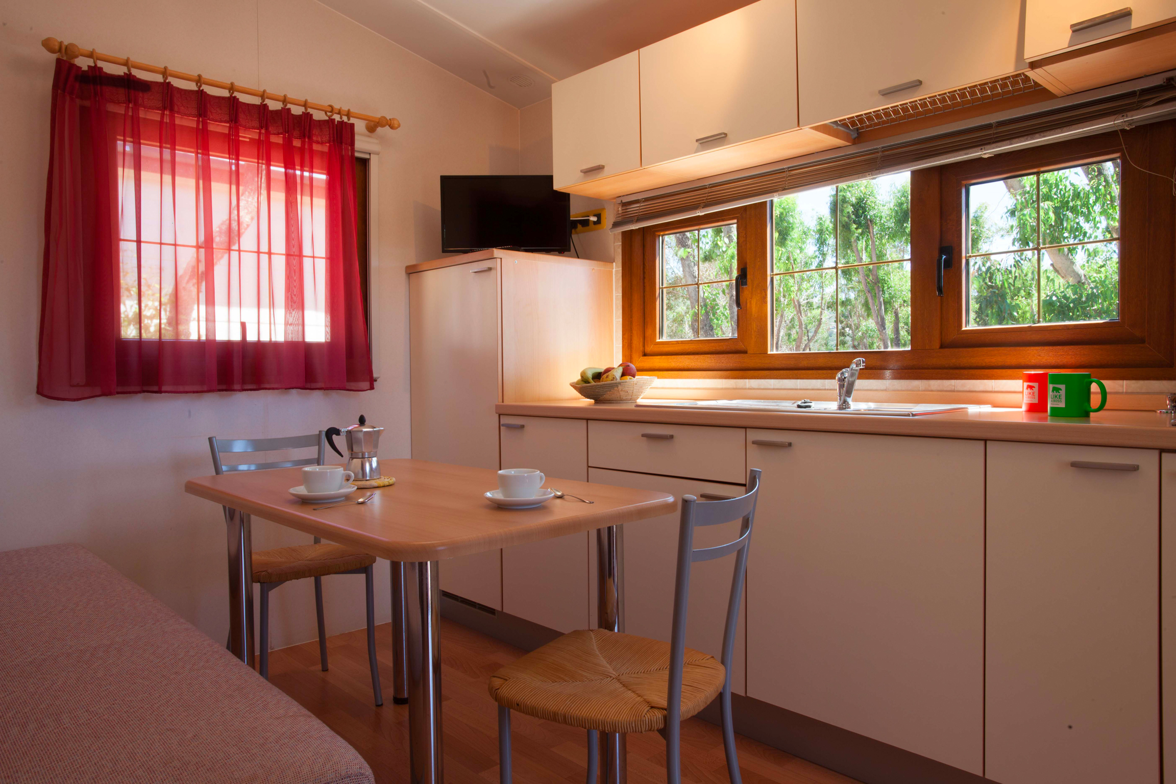 It has an area of approximately 24 sq.m. and can sleep a maximum of 4 adults and 1 junior. It comprises a double bedroom, a bedroom with two single beds and a raised bed (two single beds may be joined), a bathroom with toilet, shower, bidet, washbasin, living / dining dining table and sofa, kitchenette with sink and refrigerator. Outside table and chairs. The mobile home includes cutlery, crockery, blankets and pillows. Air conditioning has to be paid extra.