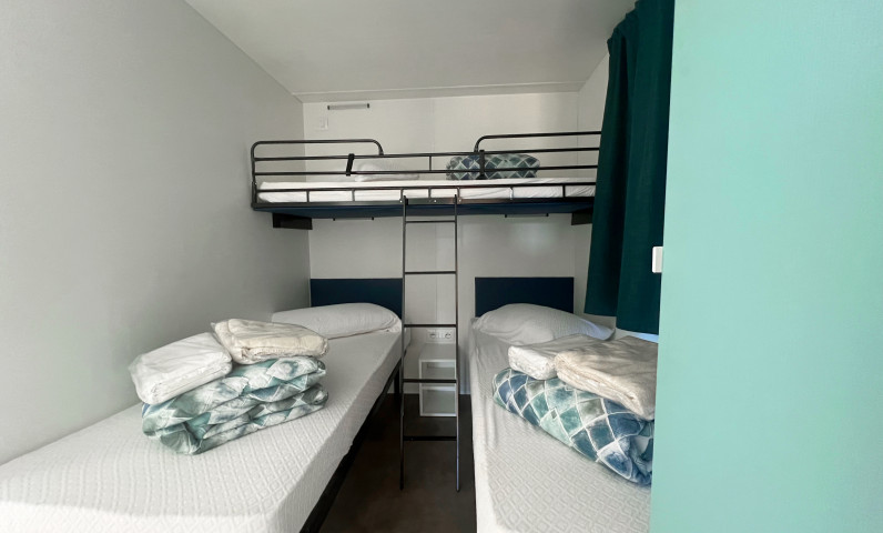 The sleeping area consists of 2 bedrooms, one with a double bed and one with 3 single beds with bankbed.