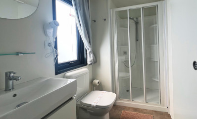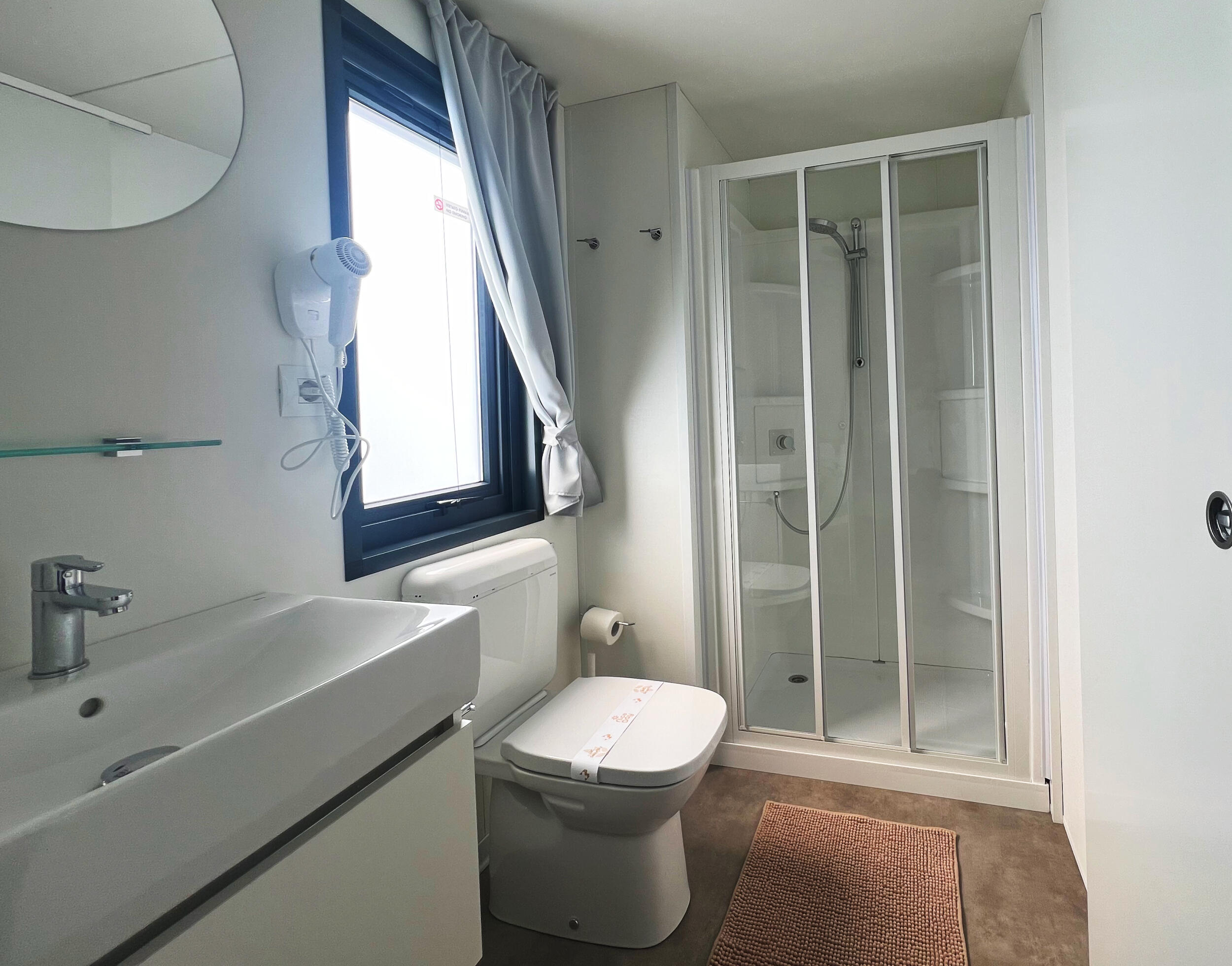 It has an area of 25mq and can hold up to 5 persons. It is composed of a living room with table and chairs, a kitchenette equipped with a column fridge with a freezer, a 4-burner gas cooker, a sink, pots and pans and dishes.