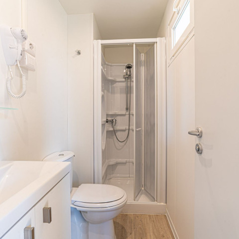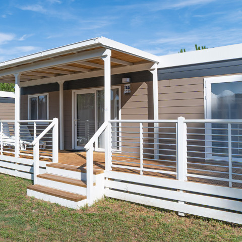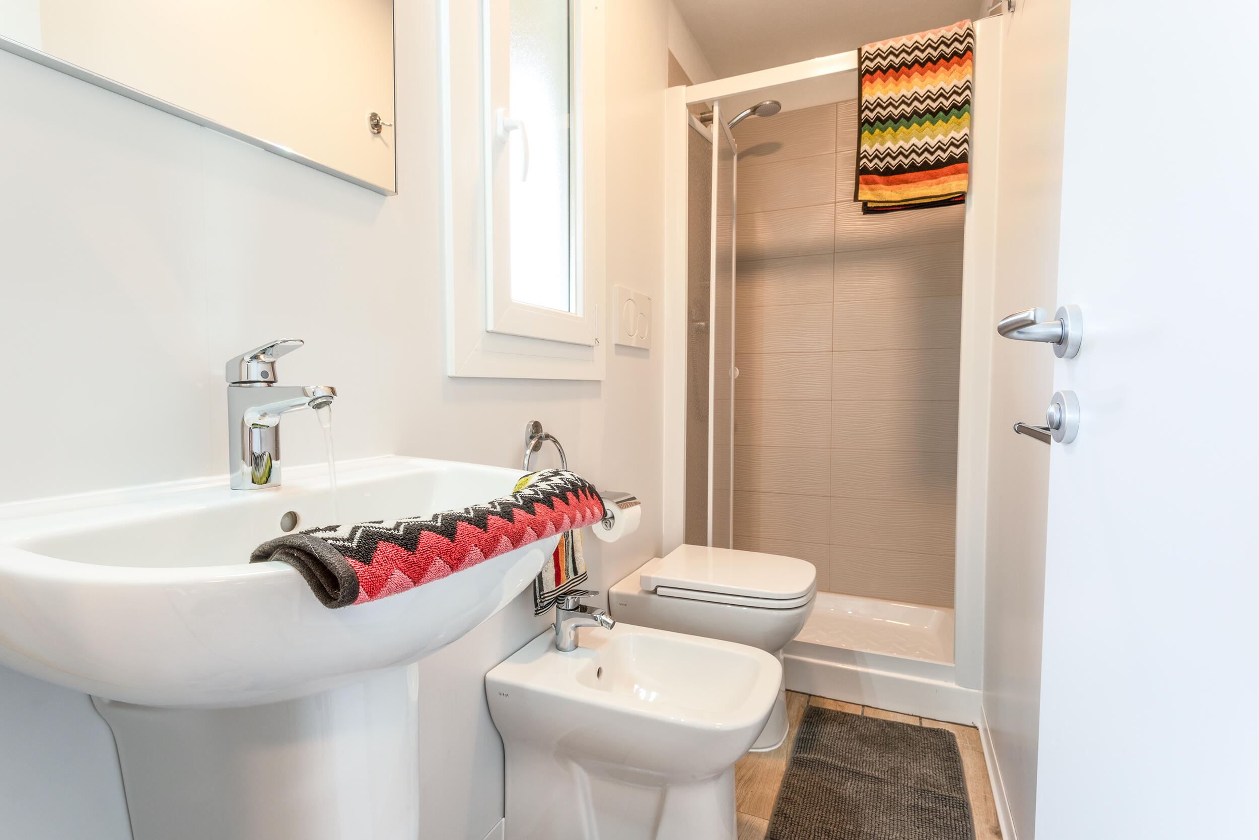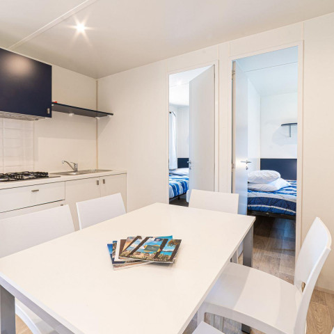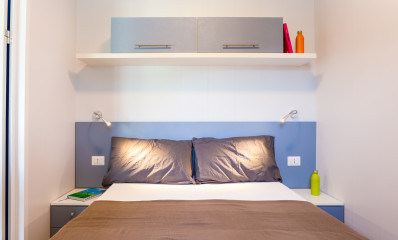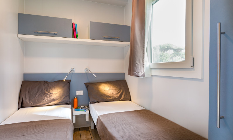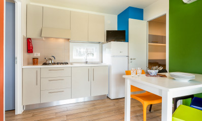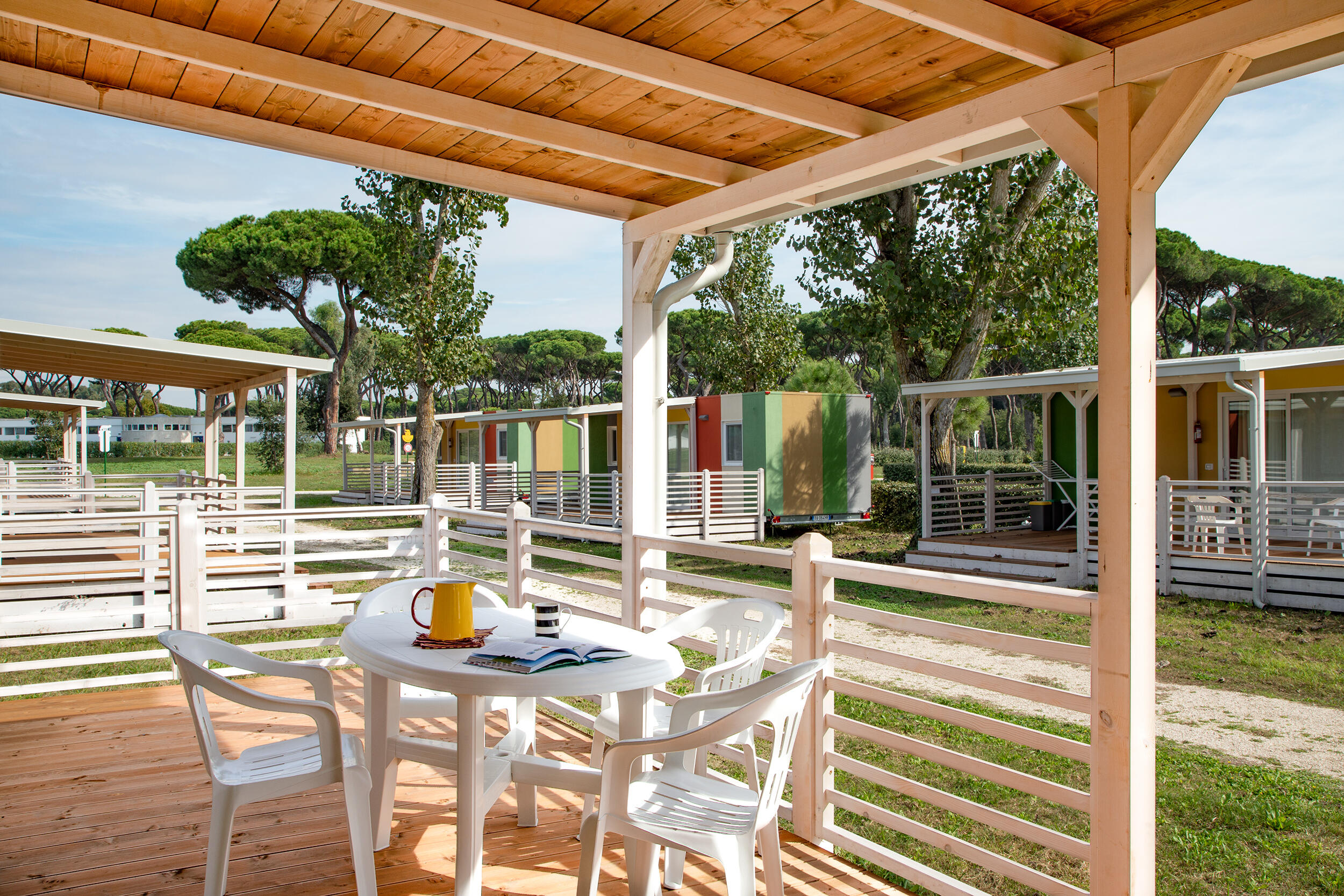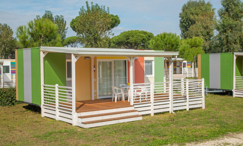 The Baia Tevere, about 24mkq large, can host up to 4 persons. It is composed of a bedroom with double ed and a second one with 2 twin beds. It has got a living room with table and chairs, kitchenette with fridge, pans and dishes. The bathroom has got the WC, shower, sink and bidet. Outside a covered wood terrace with table and chairs.