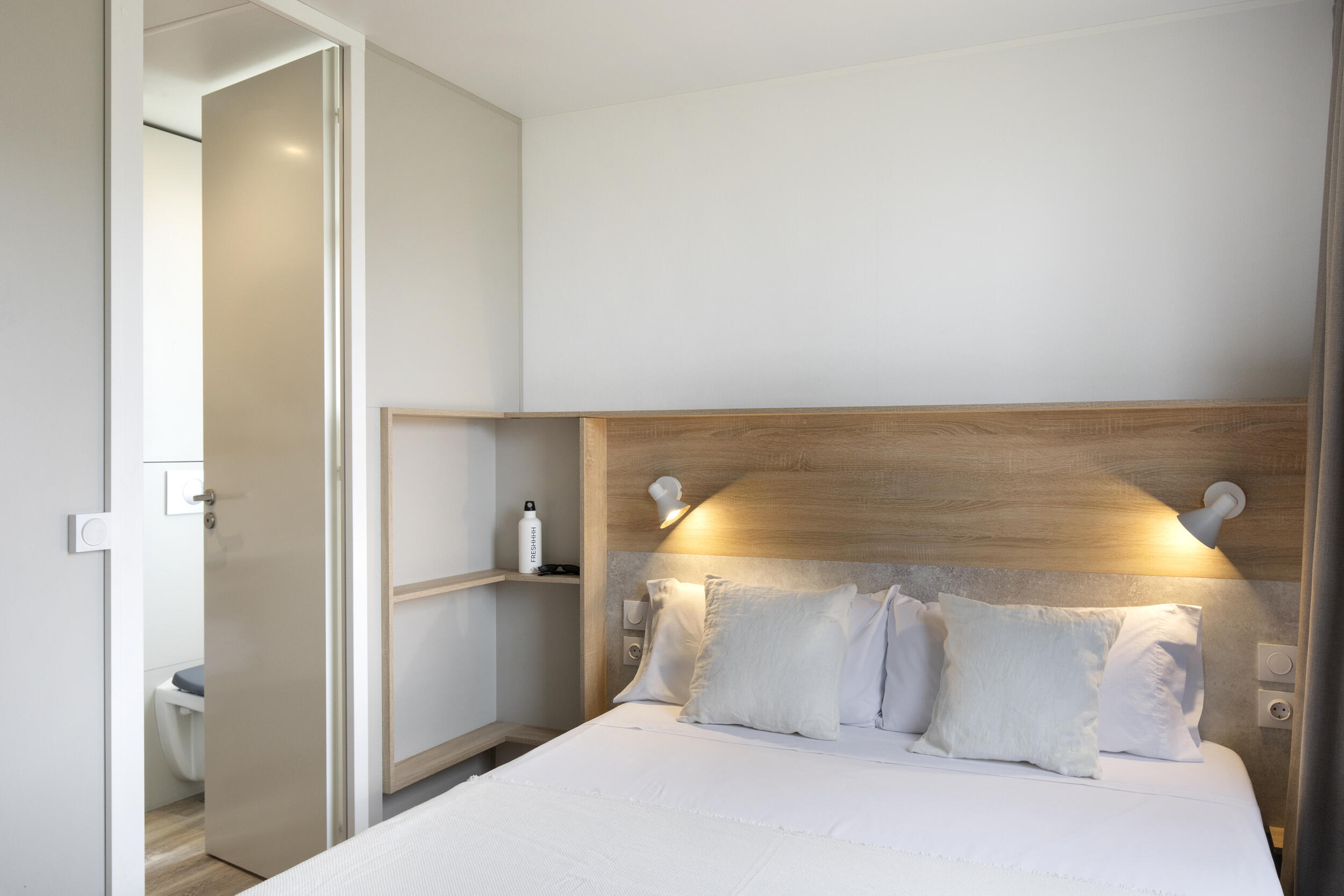 Le Mobil Home Family XL est le choix idéal pour vos vacances en famille ou en groupe d'amis. Nous l'avons conçu avec soin pour accueillir jusqu'à 4 personnes. Ces mobil-homes modernes offrent un intérieur détaillé et spacieux pour votre confort. Chaque mobile home dispose de deux chambres bien aménagées : une avec un lit double et une avec deux lits simples. En outre, vous profiterez d'une terrasse confortable avec une véranda meublée, idéale pour se détendre à l'ombre. La cuisine est entièrement équipée d'une plaque vitrocéramique, d'un four à micro-ondes, d'un réfrigérateur, d'ustensiles de cuisine et de couverts, ce qui vous permettra de préparer vos propres repas. La salle de bains comprend une douche et des toilettes pour votre confort. Les chiens sont les bienvenus dans cette Mobile home.