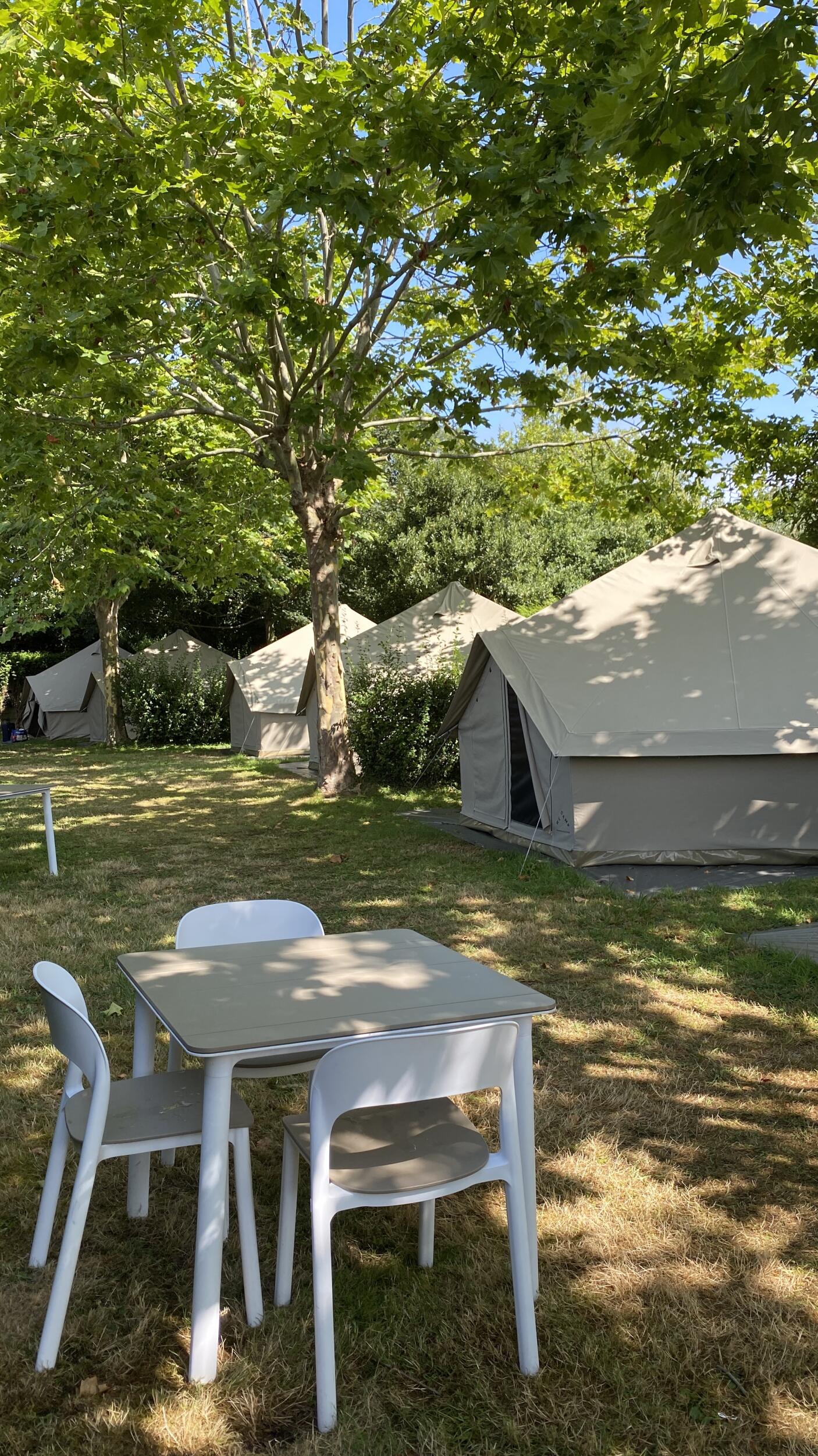 Notre tente Bell est idéale pour les couples ou les groupes de trois personnes qui recherchent quelque chose de différent en pleine nature au camping, avec une touche de luxe. Elle n'a pas de cuisine ni de salle de bain privée, mais les toilettes publiques se trouvent à quelques mètres de la tente. Le plus beau ? Elle dispose d'un lit double et d'un lit simple confortables, de tout le nécessaire (serviettes et draps), d'un mini-réfrigérateur, d'ustensiles de cuisine et d'un four à micro-ondes. Les chiens et les bébés ne sont pas admis dans cette tente.