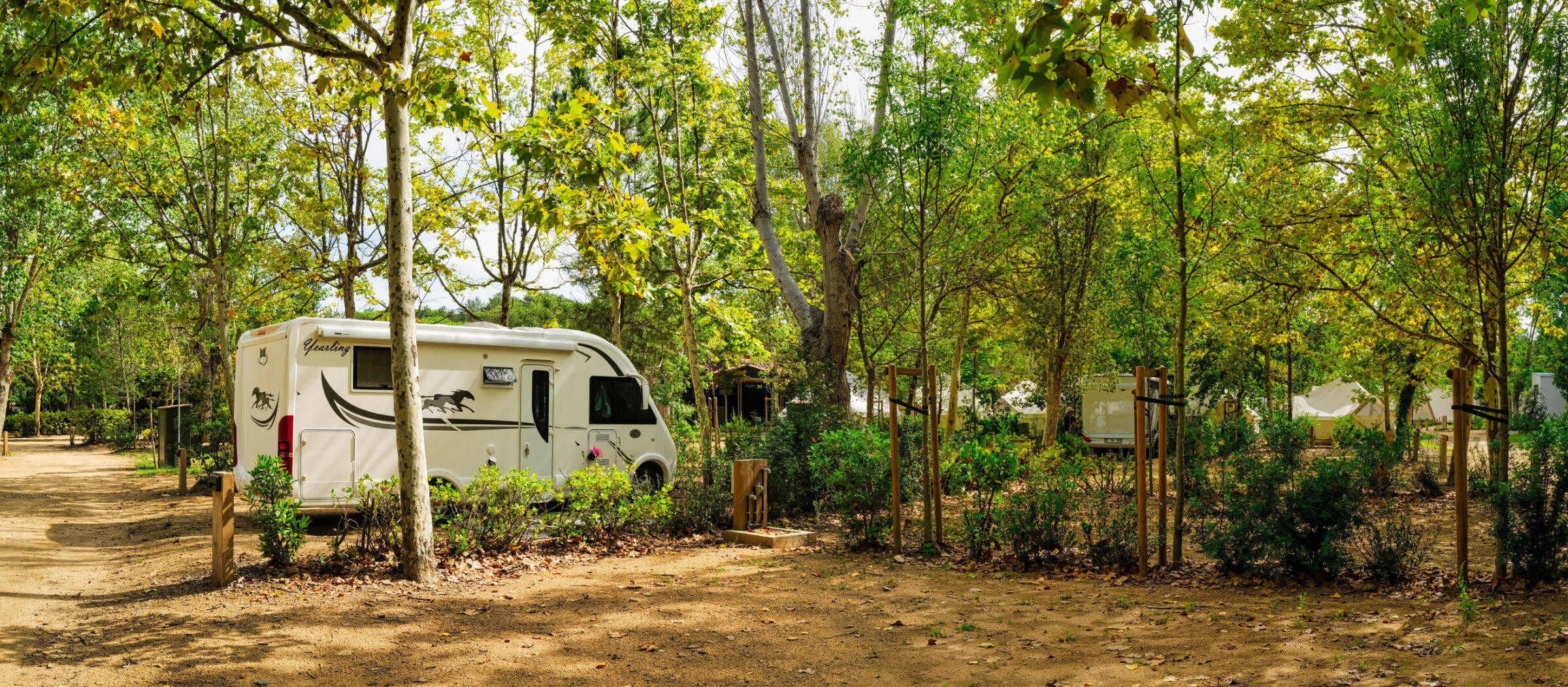 Emplacements de 90 à 110 m2 en pleine nature, entourés de pins et de chênes-lièges, équipés d'électricité 16A et d'eau (EN OPTION) exclusivement pour les camping-cars et les caravanes.