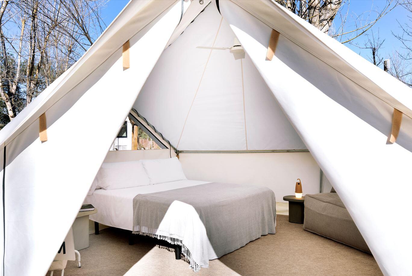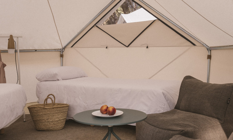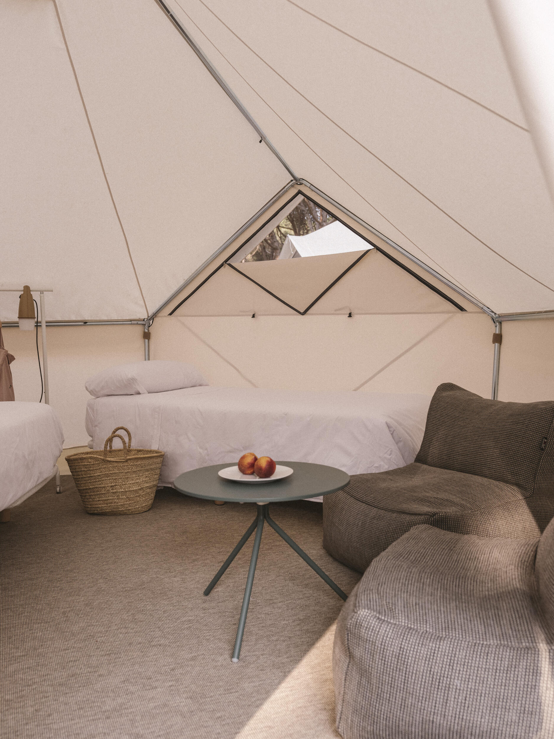 Notre tente Bell est idéale pour les couples ou les groupes de trois personnes qui recherchent quelque chose de différent en pleine nature au camping, avec une touche de luxe. Elle n'a pas de cuisine ni de salle de bain privée, mais les toilettes publiques se trouvent à quelques mètres de la tente. Le plus beau ? Elle dispose d'un lit double et d'un lit simple confortables, de tout le nécessaire (serviettes et draps), d'un mini-réfrigérateur, d'ustensiles de cuisine et d'un four à micro-ondes.
