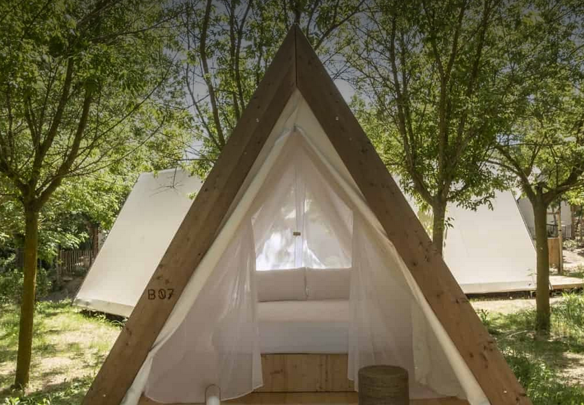 Notre tente-cabine, qui comprend un lit double confortable, n'est pas équipée d'une cuisine ou d'une salle de bain privée, mais ne vous inquiétez pas, il y a des toilettes publiques à quelques mètres de la tente. C'est notre version moderne de la tente canadienne classique. Elle est conçue spécialement pour les couples qui souhaitent vivre une expérience différente en pleine nature, avec une touche de luxe. Semblable à un hôtel, mais avec des avantages supplémentaires tels que moustiquaire, réfrigérateur, serviettes, draps de lit. Les chiens et les bébés ne sont pas admis dans cette tente.