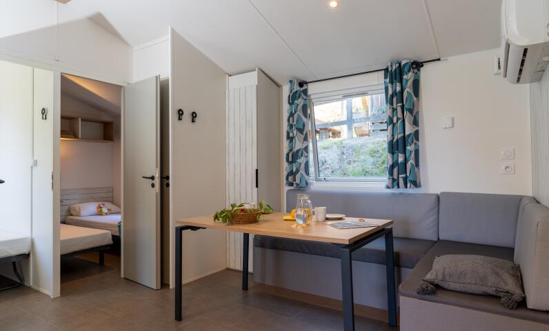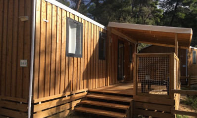 Pas de place de parking à côté de l'hébergement, accès à pied par les escaliers, 1 voiture gratuite par logement, parking à proximité dans le camping.