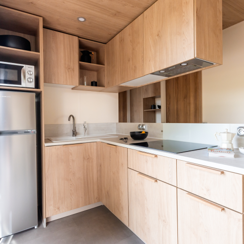 Cuisine équipée avec Lave-vaisselle, vaisselle, micro-ondes, plaques cuisson electrique, réfrigérateur avec congélateur grille-pain, bouilloire, cafetière Nexpresso à capsules.
