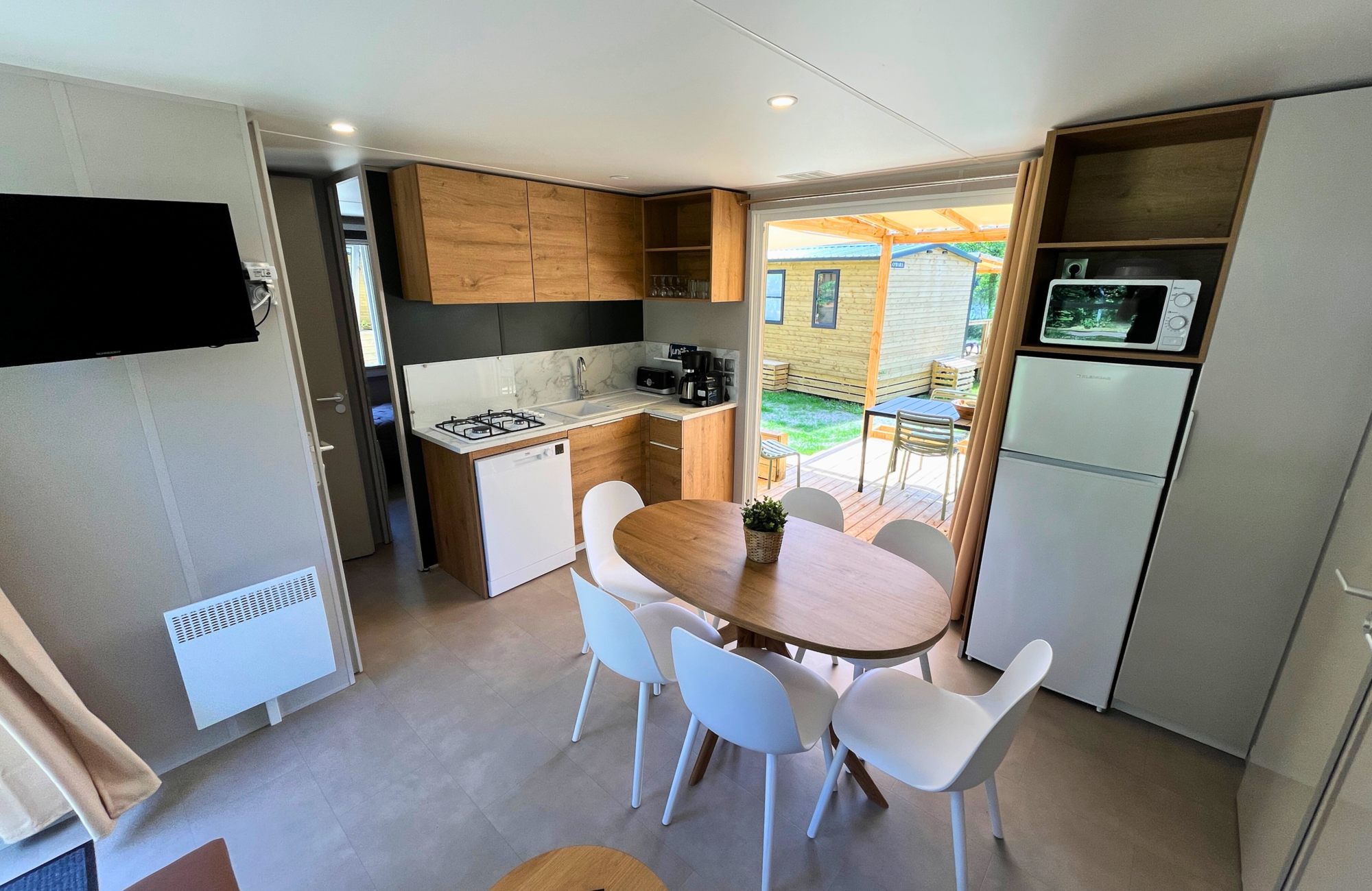 À l’intérieur, la lumière naturelle et le parfum du bois créent une ambiance chaleureuse. Vous y trouverez une cuisine équipée ouverte sur le séjour, une spacieuse salle de douche, ainsi que des chambres confortables pour des nuits reposantes avant vos activités du lendemain.
