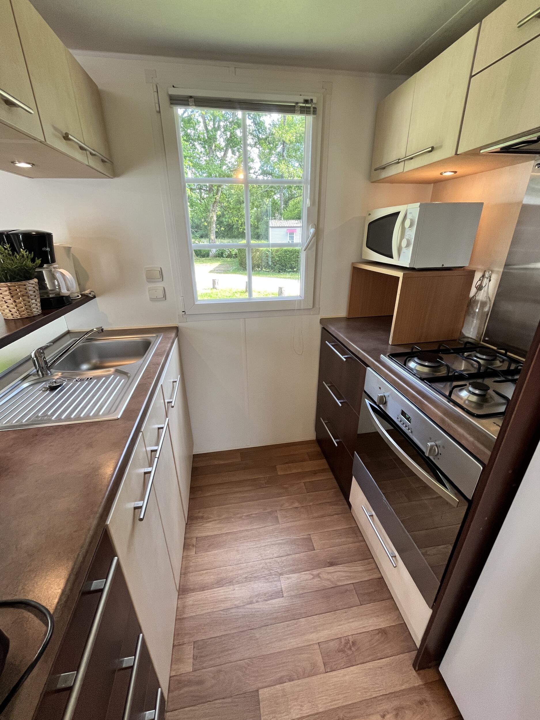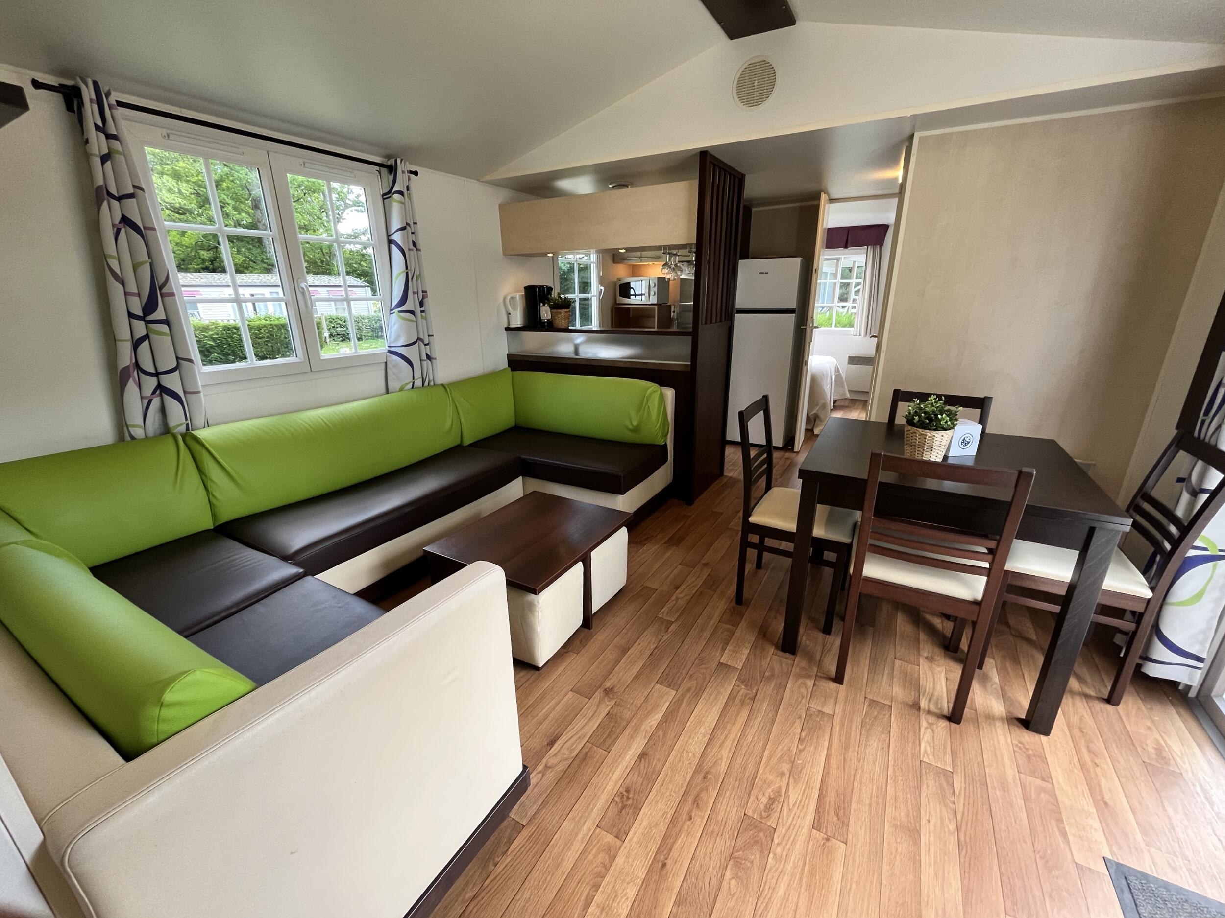 À l’intérieur, vous découvrirez un espace lumineux où les matériaux chaleureux créent une ambiance douce et accueillante. La pièce de vie réunit une cuisine équipée ouverte sur un salon convivial, une salle de douche fonctionnelle, ainsi que des espaces nuit pensés pour garantir un repos de qualité après vos activités.