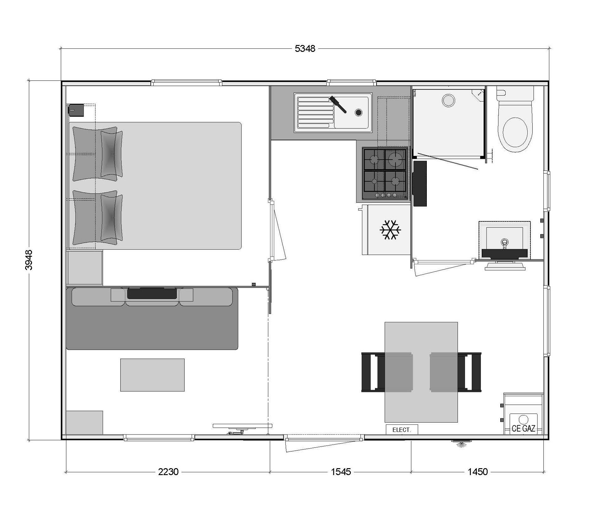 Mobil-home Premium 19m² (1 chambre) + Lave-vaisselle + Terrasse semi-couverte 11m²