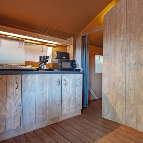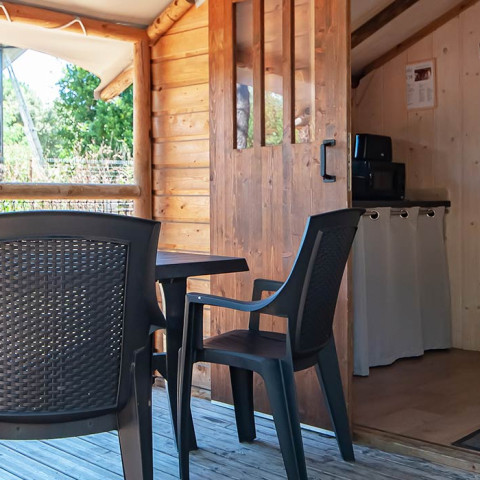 Ancrée au cœur de leur environnement préservé, cette location mixant tente et cabane en bois vous immerge en pleine nature. Bercé par le chant des oiseaux et le parfum des pins, installez-vous confortablement dans ses chambres cosy, sa salle principale équipée d’une kitchenette et sa terrasse ombragée.