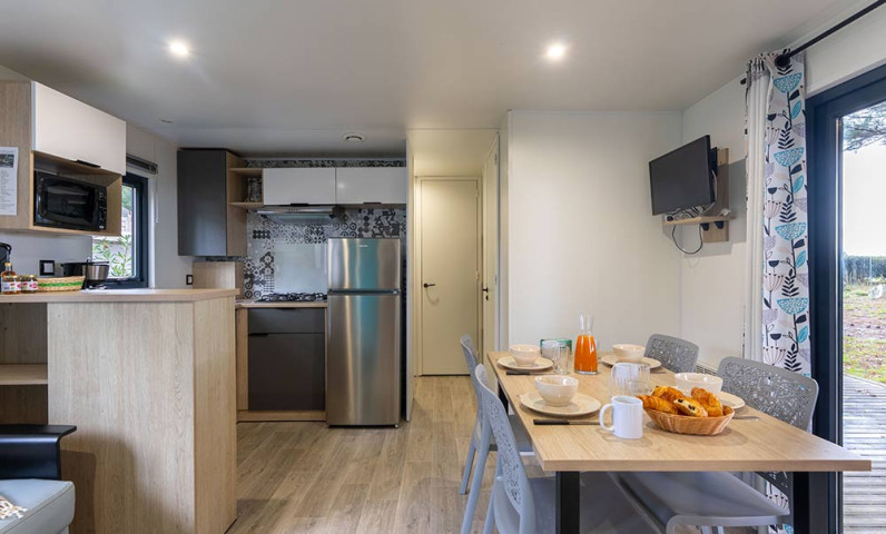 Lits faits à votre arrivée dans l'hébergement, ménage de fin de séjour pris en charge par le camping, linge de maison fourni, location d'équipements...