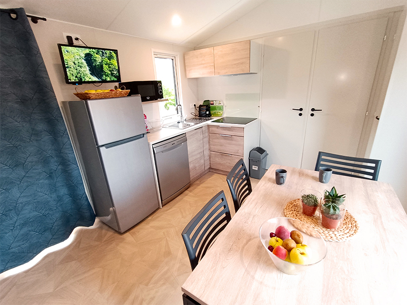 Lits faits à votre arrivée dans l'hébergement, ménage de fin de séjour pris en charge par le camping, linge de maison fourni, location d'équipements...