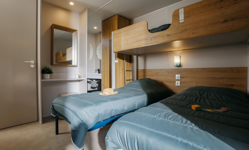 Avec ses deux chambres en véritables suites, chacune dotée de sa propre salle d’eau et de WC indépendants, ce modèle séduit par son confort exceptionnel et son ambiance chaleureuse portée par un mobilier tout en bois. Les familles comme les couples d’amis y trouvent un espace intime, élégant et parfaitement pensé pour que chacun profite de son séjour en toute tranquillité.