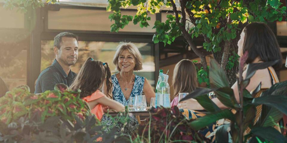 Au milieu de ce cadre boisé et fleuri, partagez un instant gourmand avec vos proches tout en profitant d'une vue imprenable sur l’espace aquatique et sur les collines entourant le camping.
