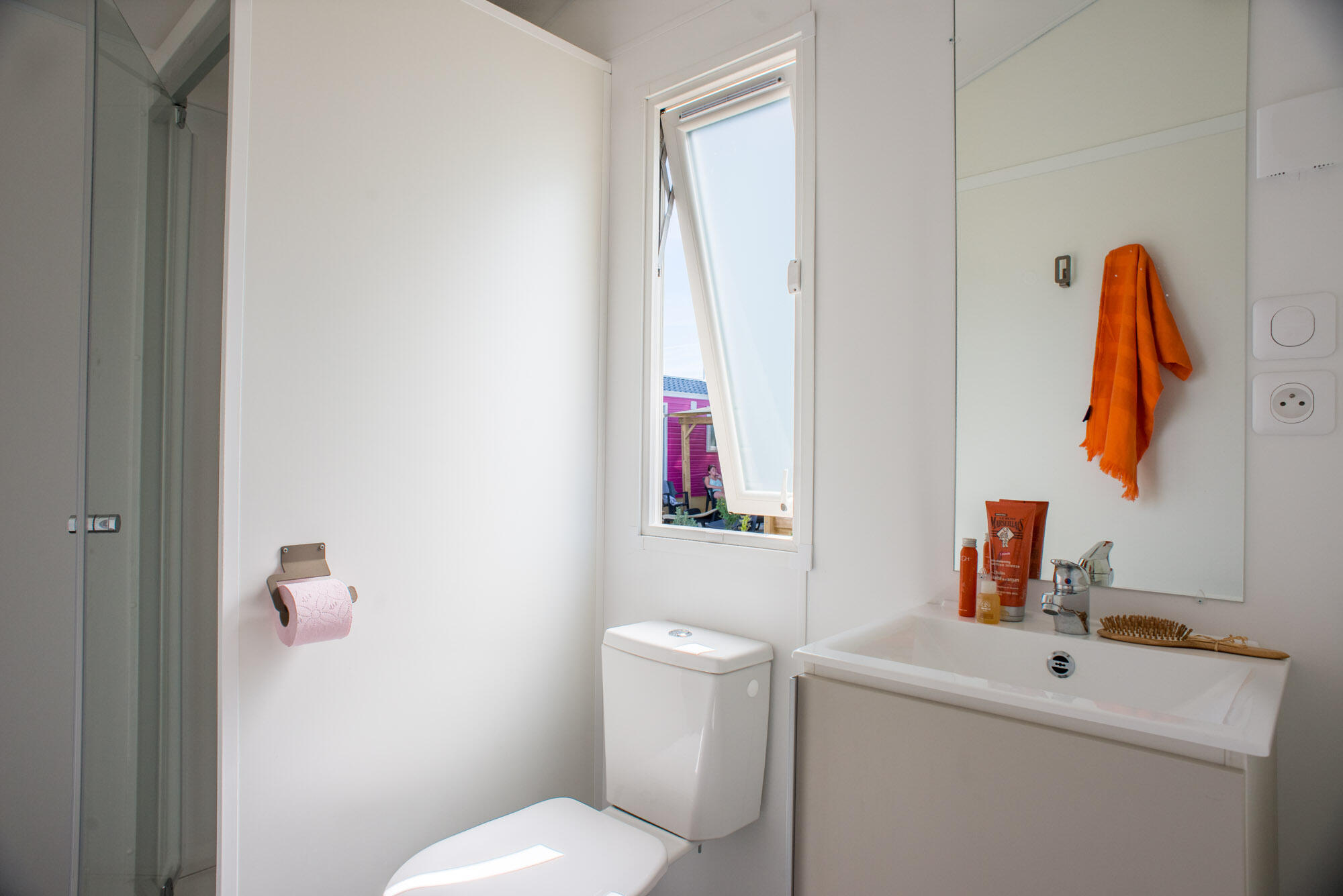 Bathroom with shower and washbasin. Separate WC.