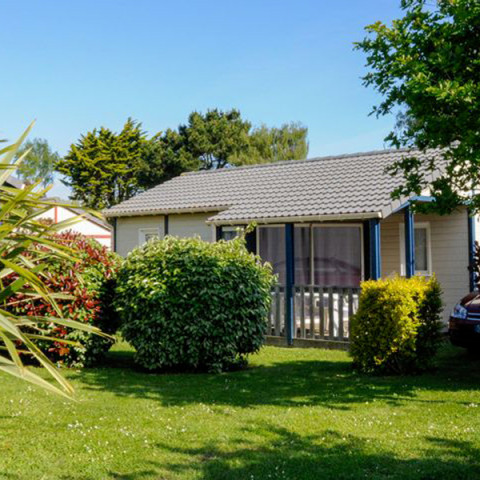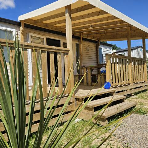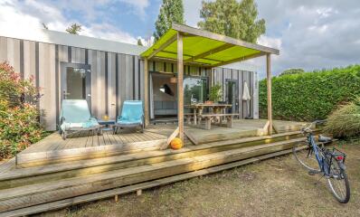 Landscaped plot, semi-covered wooden terrace, with garden furniture including: 1 table, 4 chairs, 2 deckchairs.