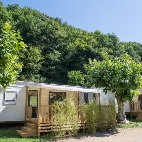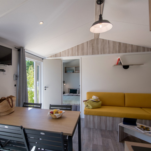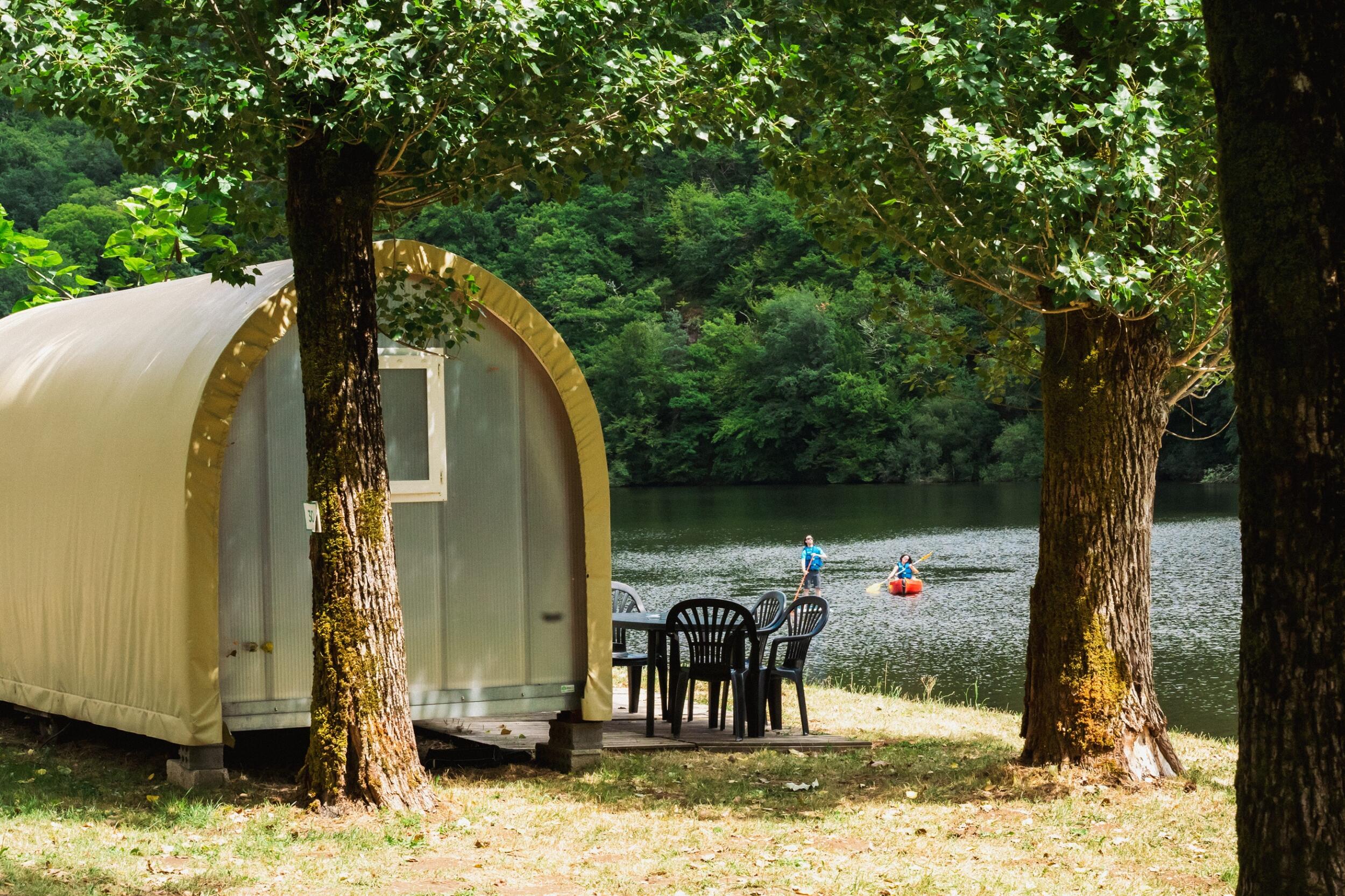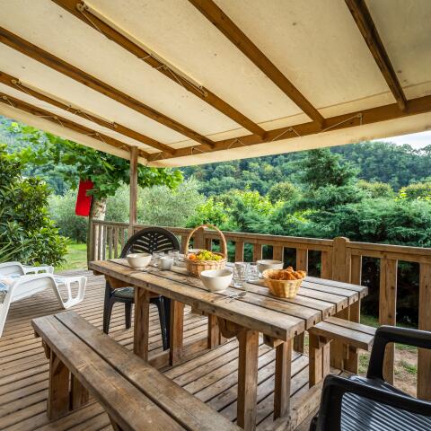 The accommodation is not equipped with a bathroom. No water supply. Sanitary facilities 250 m away. Awning which shelters a wooden terrace with 1 garden furniture including 1 table and 4 chairs.