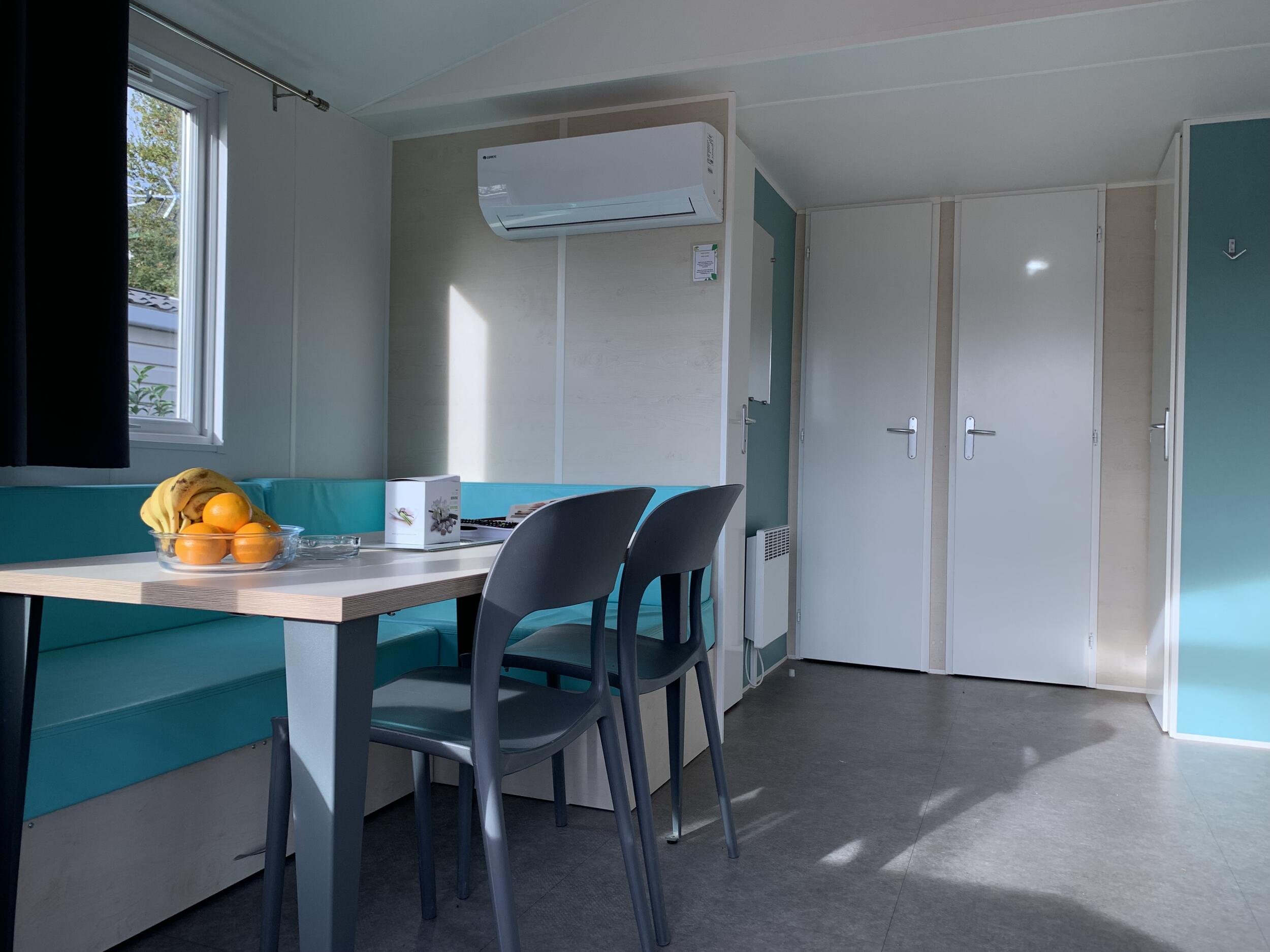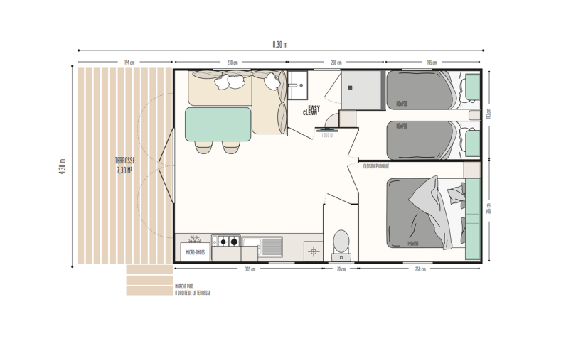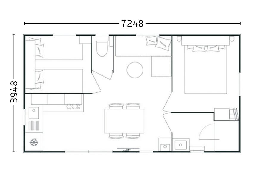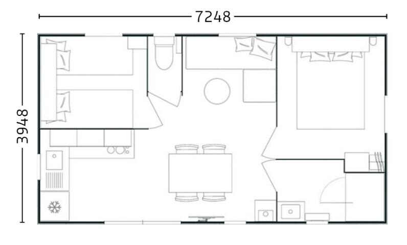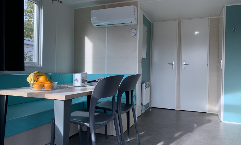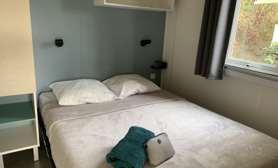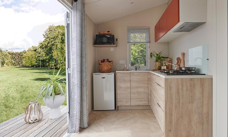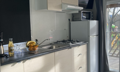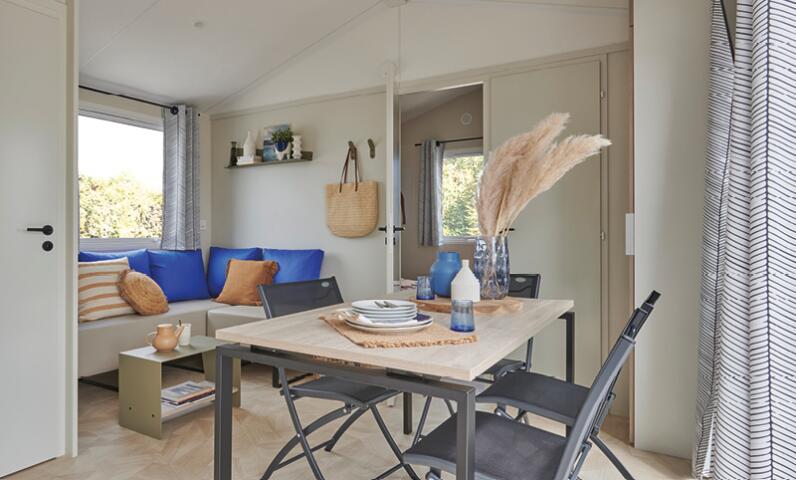 Enjoy the peace and quiet of the "Provence" mobile home, available in two versions: one with a front terrace overlooking the children's playground, and the other, a horizontal version, located near the swimming pool. All mobile homes accommodate four people, with one double bedroom and one bedroom with two single beds. The toilet is separate, and the modern, fully equipped kitchen opens onto a comfortable living area.