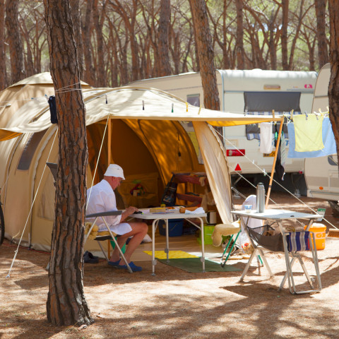 Installati nel cuore della natura e lasciati incantare dall'autenticità di campeggiare sulla spiaggia! Le nostre ampie piazzole, dotate di allaccio elettrico, accolgono il tuo camper in un ambiente tranquillo e ombreggiato.