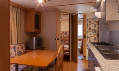 Ha una superficie di circa 24 m² e può ospitare al massimo 4 adulti e 1 bambino. È composta da soggiorno con tavolo, sedie, divano letto, angolo cucina attrezzato con frigorifero con ghiacciaia, piano cottura a 4 fuochi, lavello, pentolame e stoviglie. La zona notte si compone di 2 camere, una con letto matrimoniale e una con 2 letti singoli. L’alloggio è dotato di 1 bagno completo con doccia, lavabo e WC. All’esterno una veranda coperta che si estende per tutta la lunghezza della casa mobile è il luogo ideale per godere di una vacanza all’aria aperta.