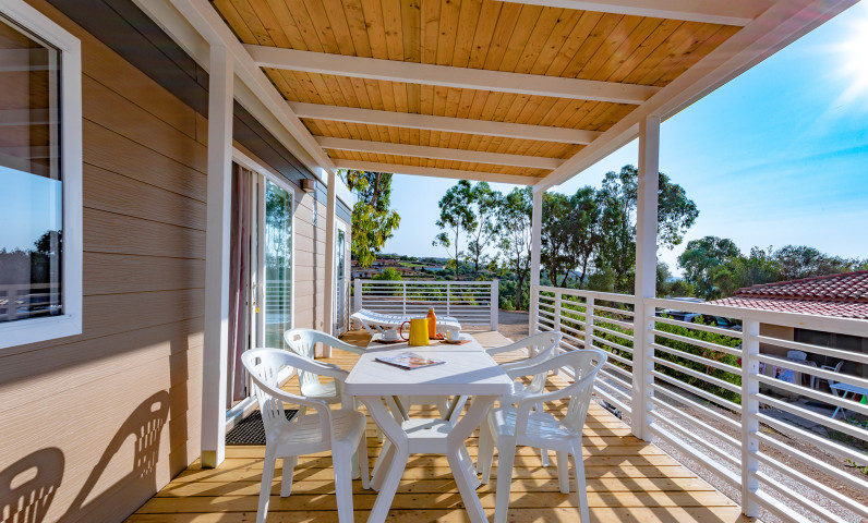 Una veranda in legno coperta, attrezzata con tavolo e sedie, consente di immergersi nella natura senza rinunciare a comfort e stile.