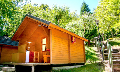 Each one includes a bedroom with a 1.35 metre double bed, wardrobe and 190 x 70 cm sofa bed, along with a covered porch that houses a kitchen and fridge. Bed linen and kitchen utensils are recommended. Strategically located in a peaceful setting with stunning views and surrounded by trees, the cabins are close to the service pavilion, which offers individual cabins with shower, washbasin and WC for added comfort.