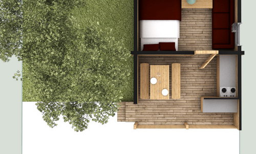 Wooden cabins of 15 m2, with a single room and capacity for 2 people and without private bathroom. They are ideal for a romantic and comfortable stay.