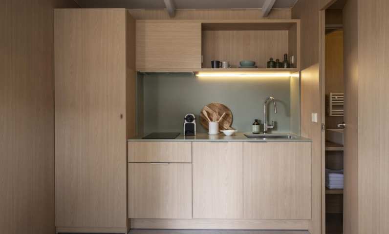 The Family Mobile Home Compact is the accommodation conceived and designed by us for your holidays with your family or group of friends up to 4 people. It is a new Mobile Home with a detailed and spacious interior. It is a mobile home with two bedrooms, one with a double bed and the other with two single beds. It also has a terrace with a furnished outside porch with shade. Equipped with kitchen with cooker, microwave, refrigerator, cooking utensils and cutlery. They have a bathroom with shower and toilet.